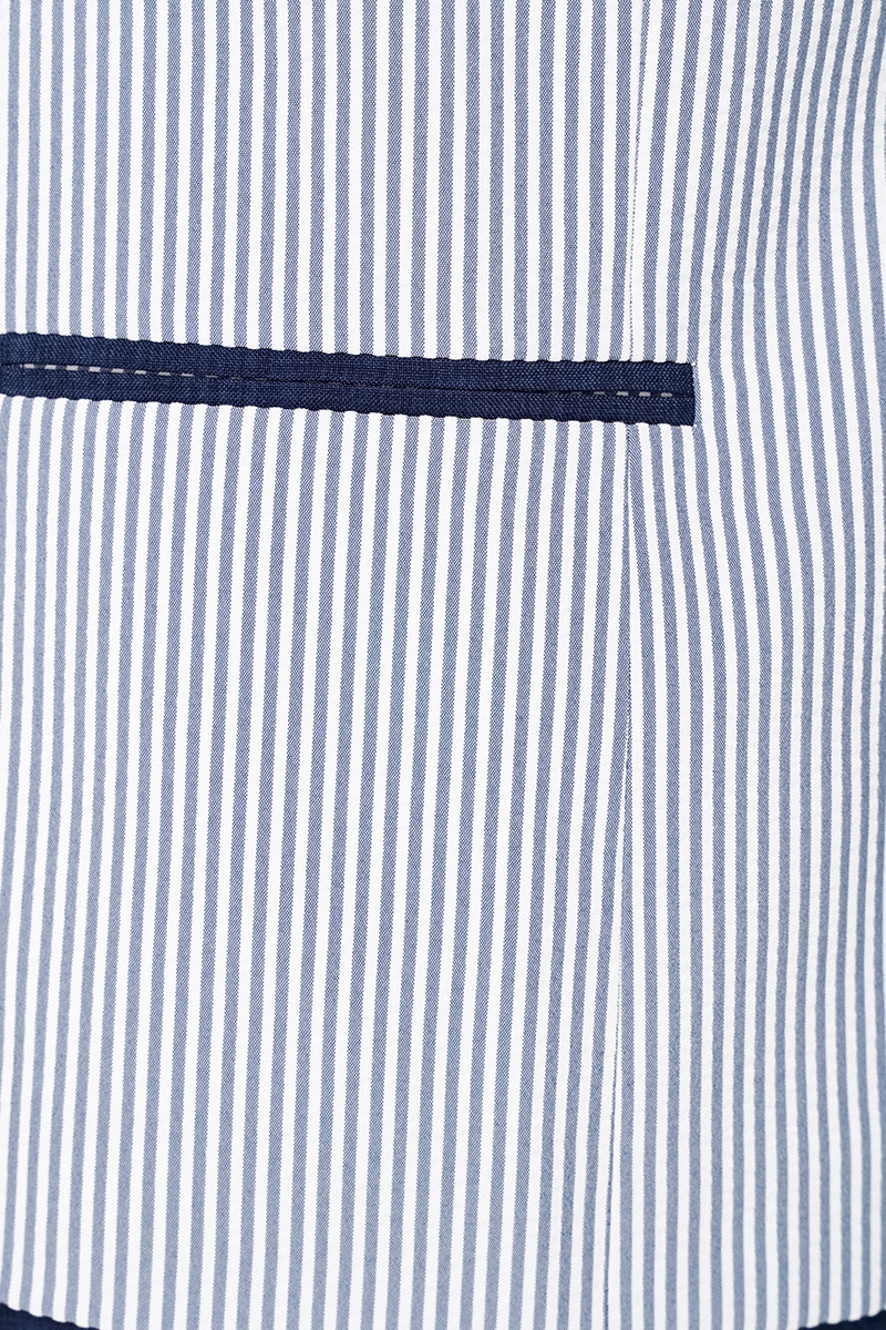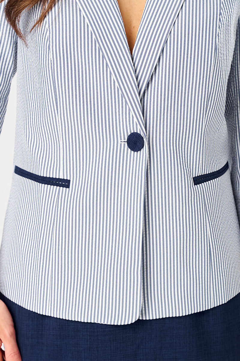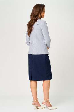 Этот женский костюм выполнен из мягкой и прочной смесовой ткани с добавлением хлопка, что обеспечивает комфорт и долговечность изделия. Жакет имеет полуприлегающий силуэт и украшен двумя вертикальными рельефами, выхогдящими от плечевого шва до линии низа, придавая изделию аккуратный и элегантный вид. Центральная бортовая застёжка выполнена на обметанную петлю с обтяжной пуговицей, добавляющей изящества и завершённости образу. На передней части жакета расположены два прорезных кармана в рамку с двойными обтачками, вставки которых выполнены из синей ткани, создавая стильный и интересный контраст. Горловина оформлена пиджачным воротником, который мягко обрамляет шею, а рукава втачного кроя длиной ¾ делают силуэт более современным и аккуратным. Спинка жакета декорирована средним швом и двумя вертикальными рельефами, подчёркивающими стройность фигуры. Жакет на хлопковой подкладке. Цветовая гамма жакета — бело-синий оттенок с полоской.