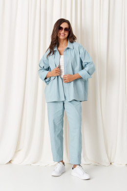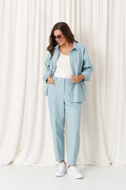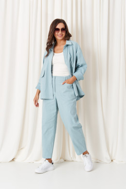 Брюки имеют слегка зауженный силуэт и верхний срез, обработанный притачным поясом с вставкой на резинке в боковой части для дополнительного комфорта. Застежка на обметанную петлю и джинсовую пуговицу обеспечивает надежную фиксацию. Передняя часть брюк украшена вытачкой по низу и карманом с подкройным бочком, а задняя половинка имеет отрезную кокетку и талиевую вытачку, что подчеркивает фигуру. Два накладных кармана с вытачкой добавляют функциональности и стиля. Брюки оснащены вставленными в пояс шлевками для ремня. Костюм выполнен в нежном мятном оттенке, который добавляет свежести и яркости в ваш гардероб, делая его идеальным выбором для различных повседневных и деловых мероприятий.