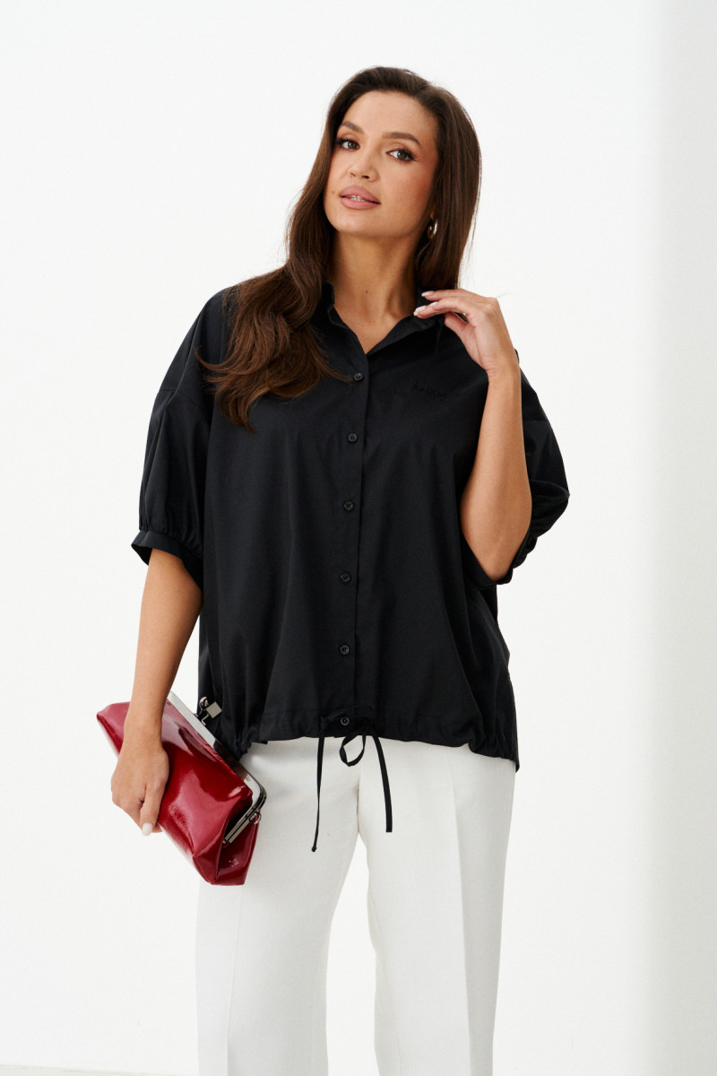 Женская блузка выполнена из смесовой ткани с высоким содержанием хлопка, что обеспечивает приятное ощущение мягкости и комфорта при носке. Модель имеет центральную бортовую застежку на аккуратные обметанные петли и пуговицы, придающую блузке классический и элегантный вид. Передняя часть украшена дизайнерской вышивкой в виде надписи, которая становится выразительной деталью и добавляет индивидуальности образу. Спинка модели дополнена кокеткой и складкой крест-накрест, что создает интересный силуэт и обеспечивает свободу движений. По низу изделия вставлена кулиса, позволяющая регулировать посадку и придающую блузке дополнительный стильный акцент. Горловина обработана рубашечным воротником, подчеркивающим универсальность и аккуратность модели. Линия плеча спущенная, что придает изделию легкую расслабленность и современный вид. Рукава втачные, длиной чуть ниже локтя, что делает блузку удобной и практичной. Нижняя часть рукавов оформлена притачной манжетой со сборкой, создающей легкий объем и завершающей изящный вид. Чёрный цвет блузки придает образу энергию и выразительность, делая её отличным элементом для создания стильных и запоминающихся комплектов.