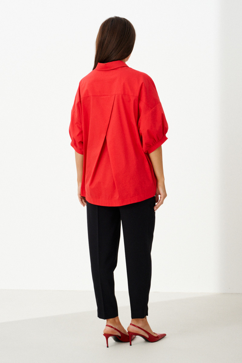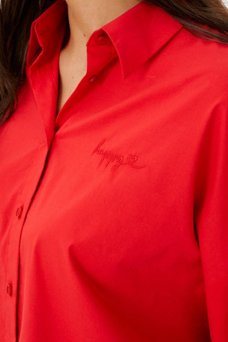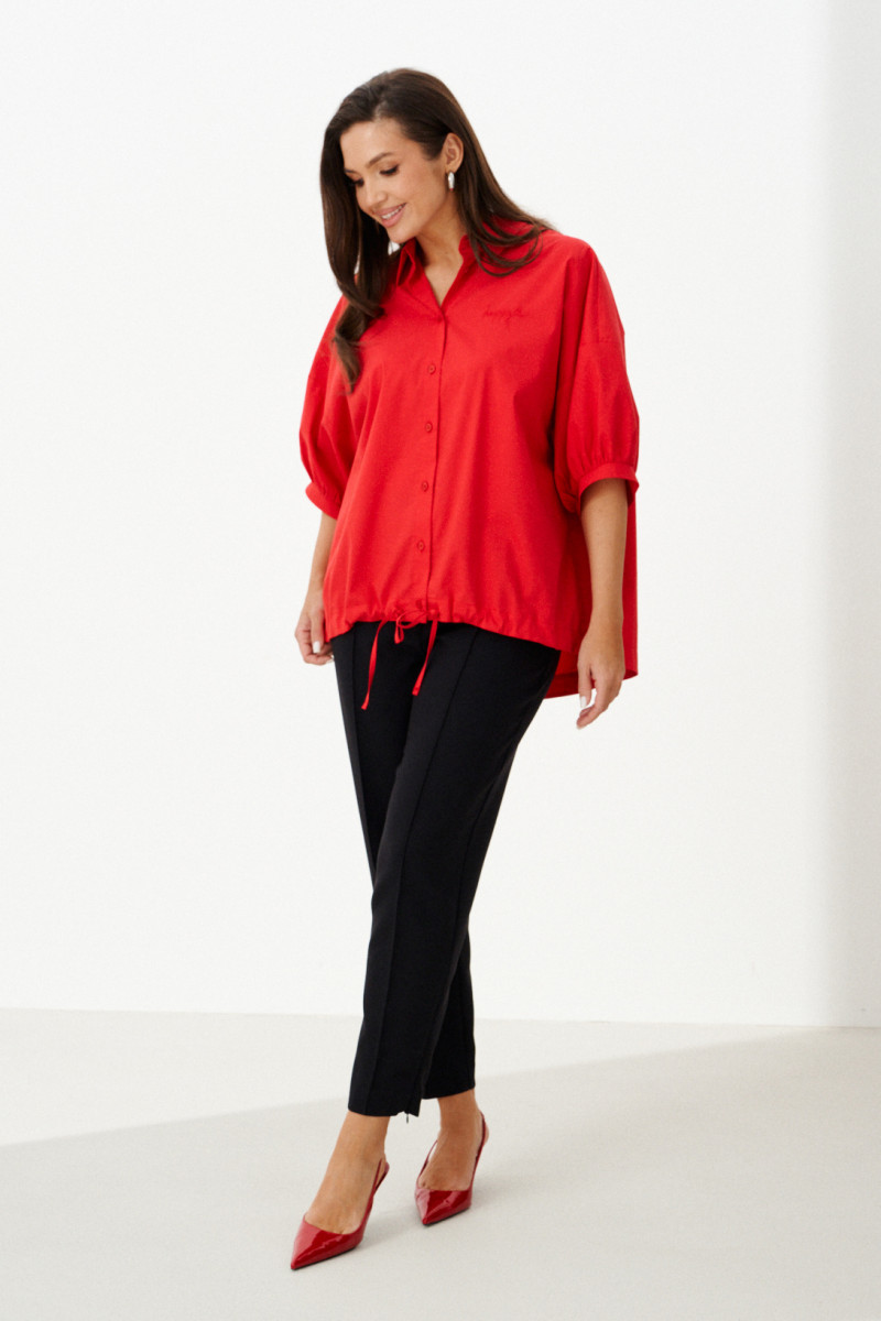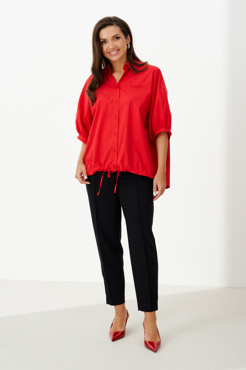 Женская блузка выполнена из смесовой ткани с высоким содержанием хлопка, что обеспечивает приятное ощущение мягкости и комфорта при носке. Модель имеет центральную бортовую застежку на аккуратные обметанные петли и пуговицы, придающую блузке классический и элегантный вид. Передняя часть украшена дизайнерской вышивкой в виде надписи, которая становится выразительной деталью и добавляет индивидуальности образу. Спинка модели дополнена кокеткой и складкой крест-накрест, что создает интересный силуэт и обеспечивает свободу движений. По низу изделия вставлена кулиса, позволяющая регулировать посадку и придающую блузке дополнительный стильный акцент. Горловина обработана рубашечным воротником, подчеркивающим универсальность и аккуратность модели. Линия плеча спущенная, что придает изделию легкую расслабленность и современный вид. Рукава втачные, длиной чуть ниже локтя, что делает блузку удобной и практичной. Нижняя часть рукавов оформлена притачной манжетой со сборкой, создающей легкий объем и завершающей изящный вид. Красный цвет блузки придает образу энергию и выразительность, делая её отличным элементом для создания стильных и запоминающихся комплектов.
