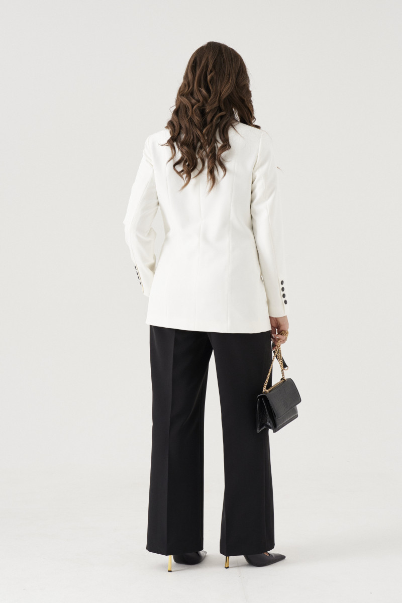 | 54 | Жакет: Длина изделия - 74см, Длина рукава - 62см, Ширина плеча - 12см, Ширина по бедрам - 62см, Ширина по груди - 57.5см, Ширина рукава - 21см; Брюки: Высота посадки - 29.5см, Длина брюк без пояса - 107см, Длина по внутреннему шву - 83см, Ширина брючин сверху - 75см, Обхват брюк по низу - 51.5см, Ширина по бедрам - 59см, Ширина по талии - 43см; Блузка: Длина изделия - 64см, Ширина плеча - 16см, Ширина по груди - 61см, Ширина по низу - 66см, Ширина рукава - 20.6см; |