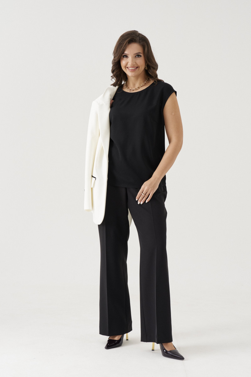 | 58 | Жакет: Длина изделия - 75см, Длина рукава - 62см, Ширина плеча - 12.3см, Ширина по бедрам - 66см, Ширина по груди - 61.5см, Ширина рукава - 22.5см; Брюки: Высота посадки - 30.5см, Длина брюк без пояса - 107.5см, Длина по внутреннему шву - 83см, Ширина брючин сверху - 79см, Обхват брюк по низу - 52.5см, Ширина по бедрам - 63см, Ширина по талии - 47см; Блузка: Длина изделия - 65см, Ширина плеча - 16см, Ширина по груди - 65см, Ширина по низу - 70см, Ширина рукава - 22см; |