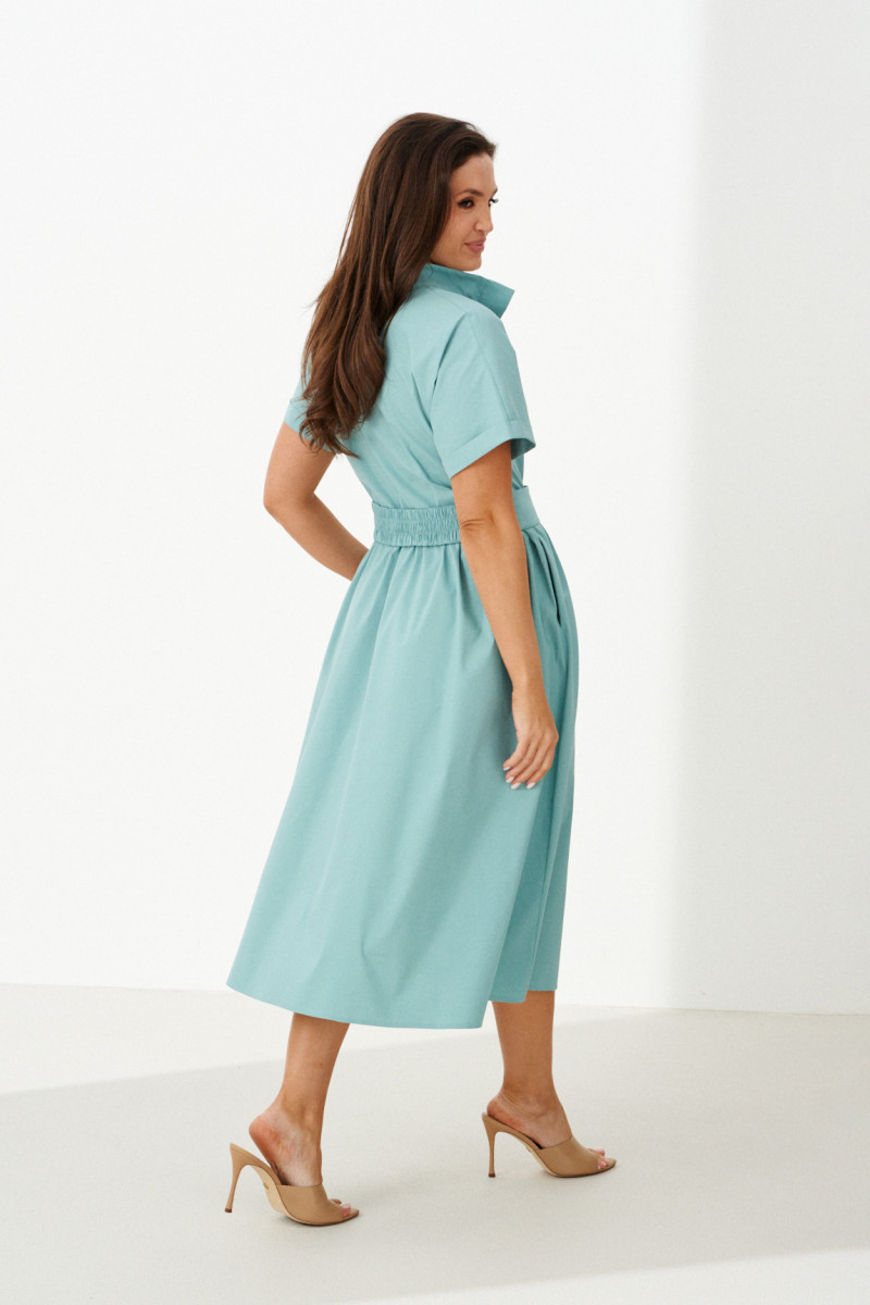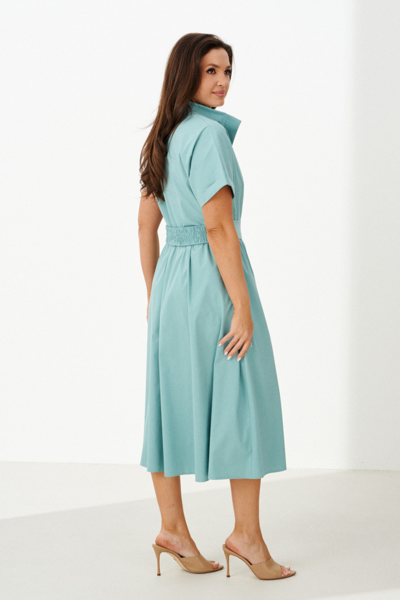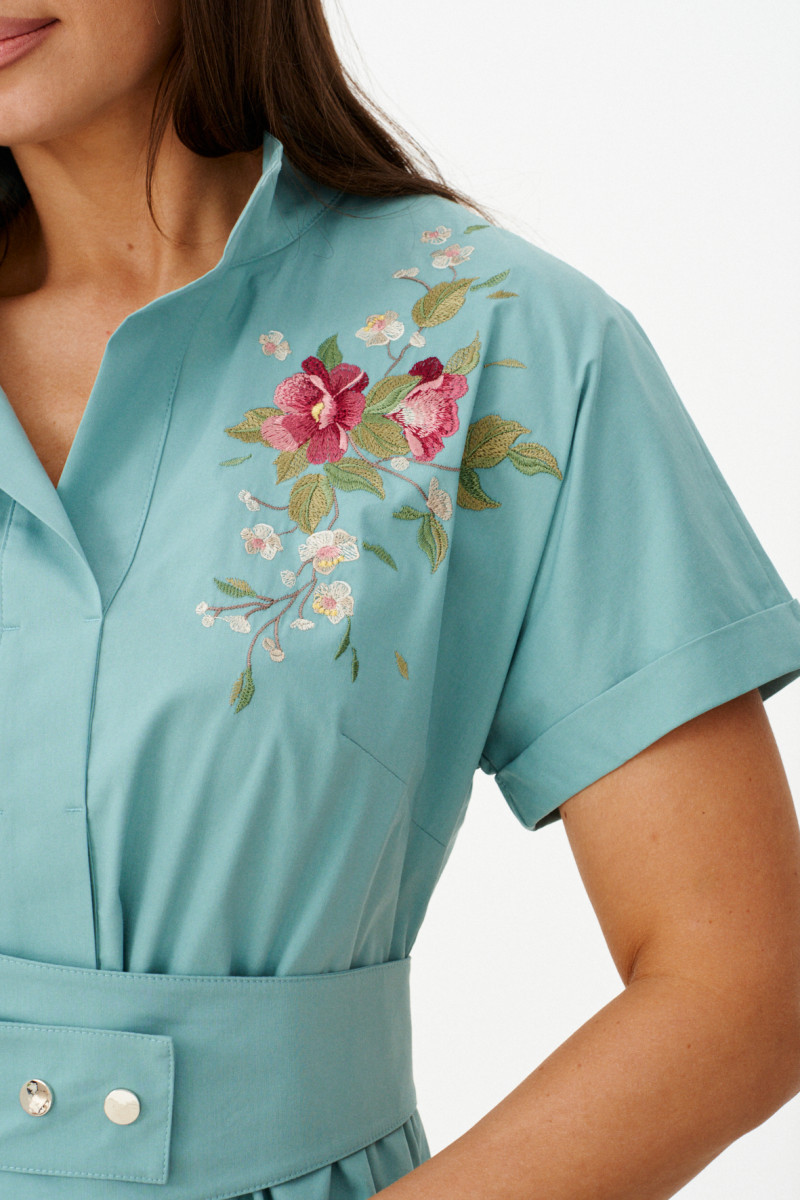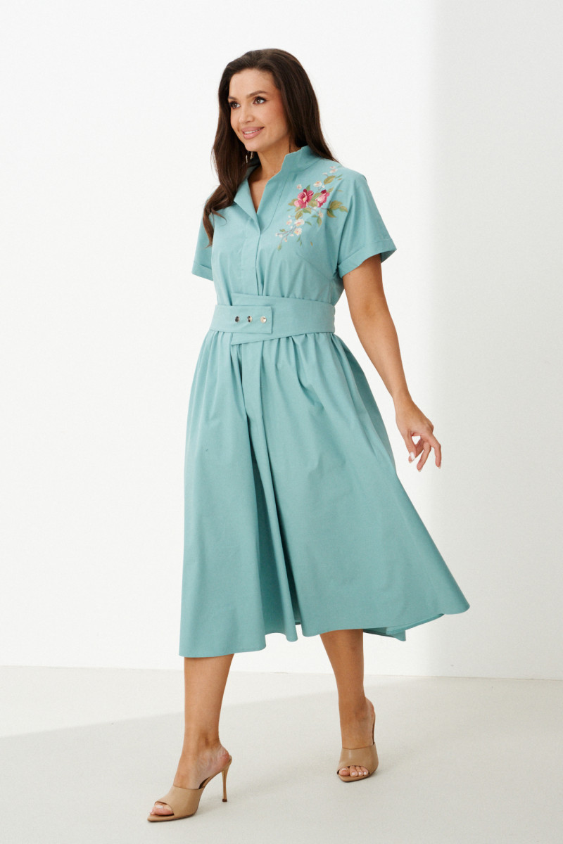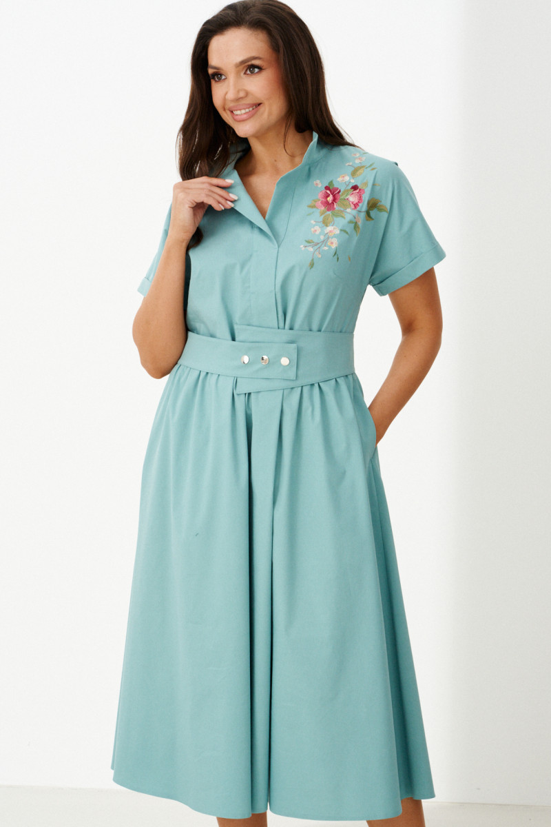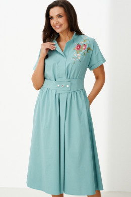 Платье женское из смесовой ткани для повседневной носки. Платье, расширенное к низу, а также отрезное по линии талии и имеет сборку. Перед имеет дизайнерскую вышивку в виде очаровательных цветов, а также две нагрудные вытачки. В боковом шве имеются потайные прорезные карманы. Горловина обработана втачной планкой и стойкой. Рукава цельнокроеные, низ рукава обработан отлетной манжетой, длинна рукава чуть выше локтя. Длинна платья макси. Для придания формы в области талии имеется пояс из основной ткани с застежкой на кнопки. В платье имеются по планке декоративные закрепки. Платье элегантного мятного цвета, в котором вы будете выглядеть очень привлекательно. За счет большого содержания хлопка в платье, ваша кожа будет чувствовать себя комфортно. Красивое и элегантное платье в котором вы будете выглядеть неотразимо.