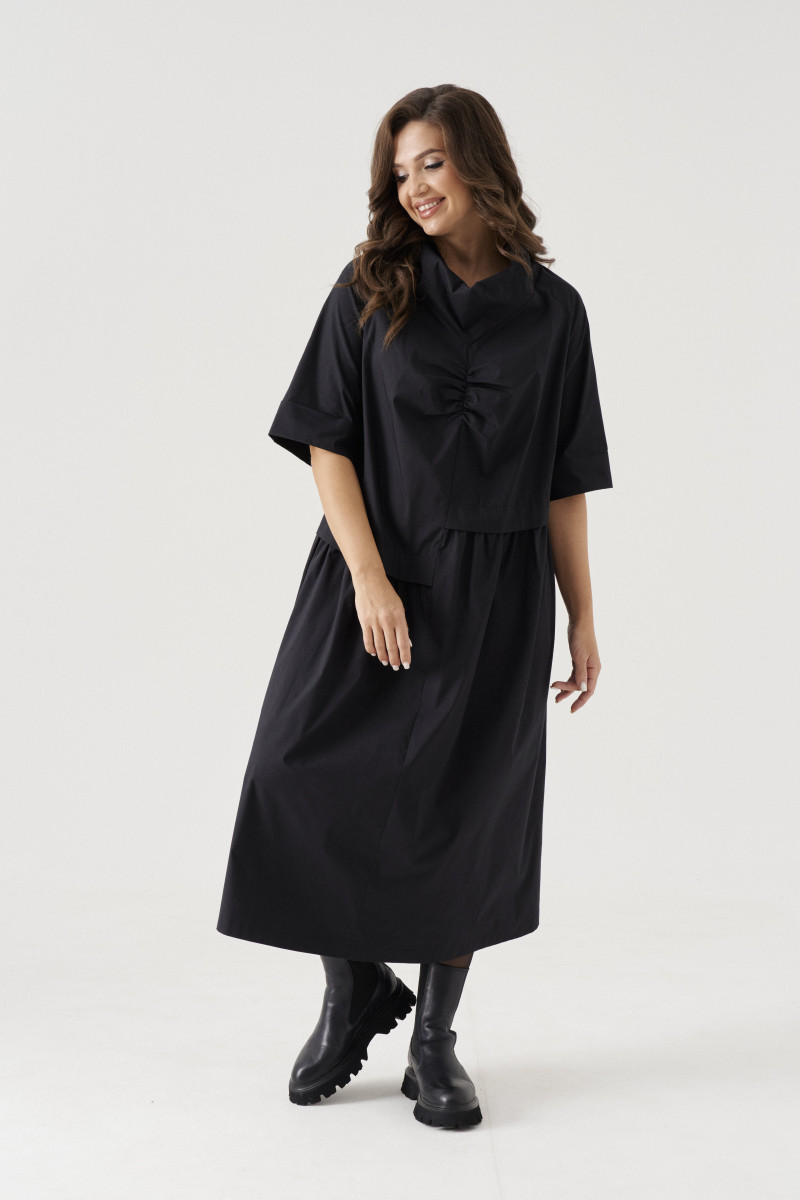 Платье женское из хлопковой ткани для повседневной носки прямого силуэта. Платье отрезное, расширенное к низу. По переду имеется ассиметричная отрезана часть лифа, стянутая в небольшие складки вдоль груди, а также имеется сборка. Спинка имеет неравномерную отрезную часть лифа и средний шов, а также сборку. Горловина обработана объемным воротником. Рукава реглан с заворотами по низу рукава. Длина платья миди. Очень интересное и модное платье которое не оставит никого равнодушным.
