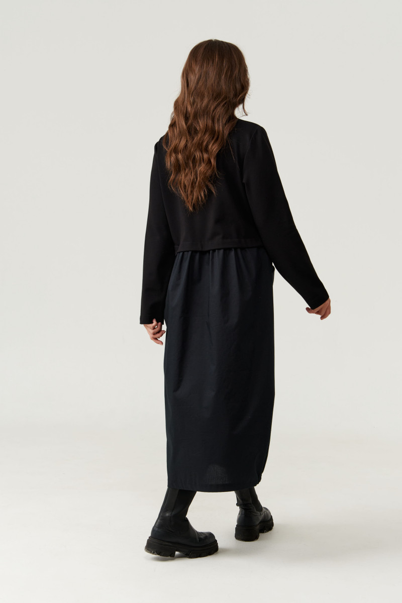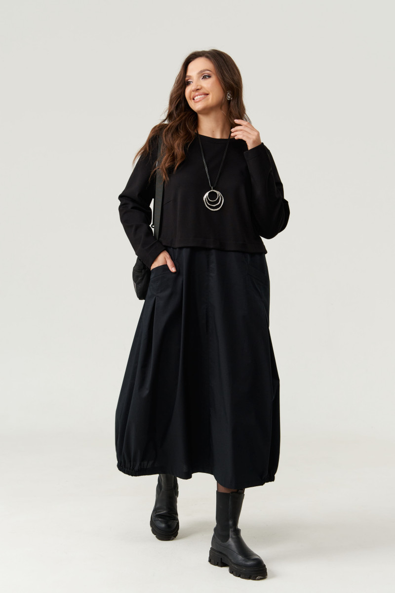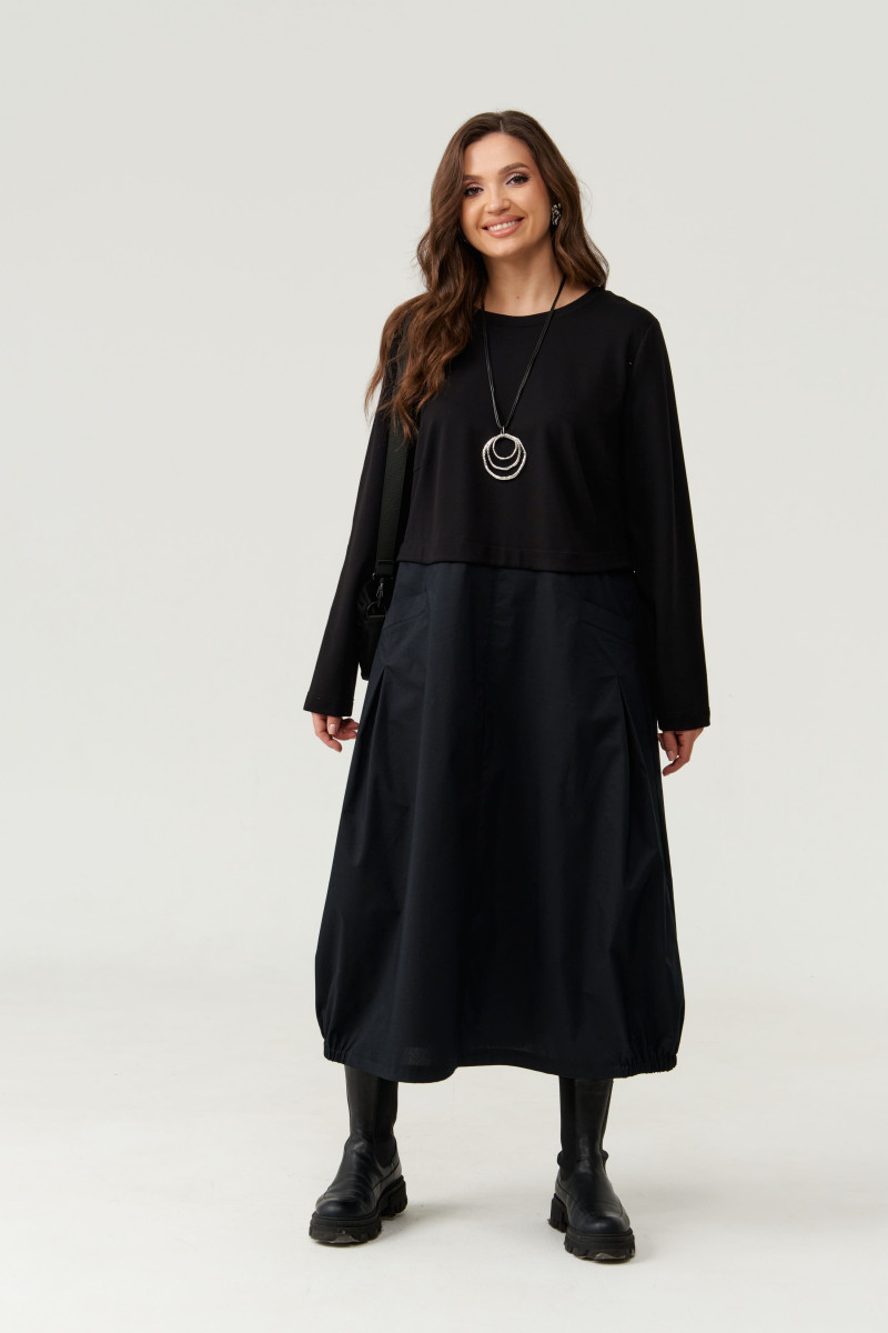 Платье женское из смесовой ткани для повседневной носки. Платье отрезное по линии талии с имитацией джемпера. Лиф переда имеет две нагрудные вытачки. Юбка платья, расширенная к низу. Низ юбки из другого материала. Переднее полотнище юбки имеет два кармана с листочкой и две складки, а также средний шов. Заднее полотнище юбки имеет небольшую сборку по линии талии. В боковых швах по низу изделия имеется вставка на резинке. Горловина чуть расширенная. Рукава втачные, длинные. Длина платья миди. Стильное платье черного оттенка станет отличным вариантом для вашего времяпровождение. В данном платье вам будет очень комфортно, а также оно отлично будет выглядеть на любой фигуре.