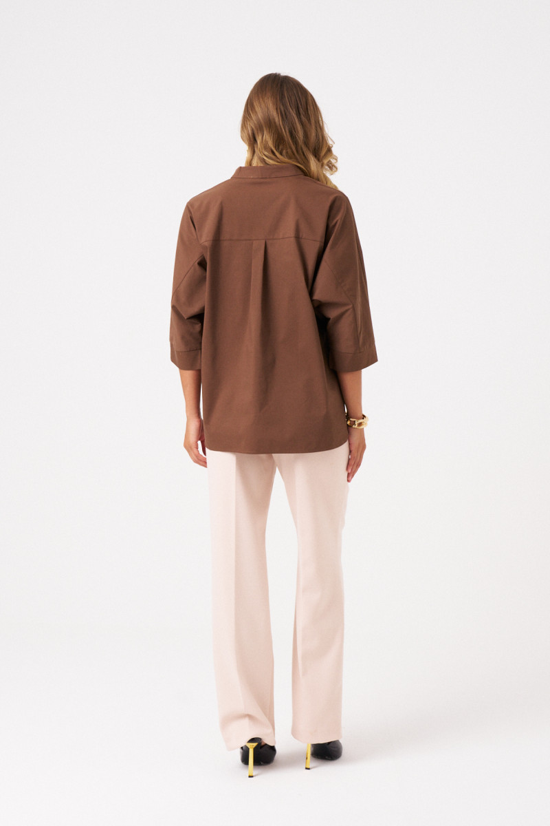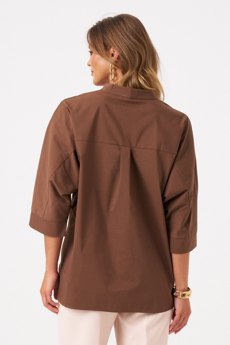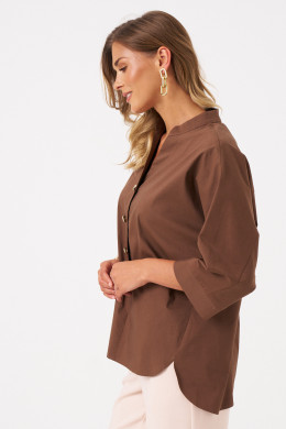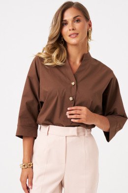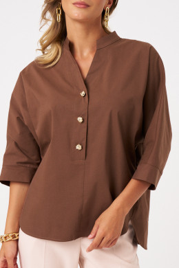 Блузка офисная свободного кроя со спущенной линией плеча. Перед с воротником-стойкой и V-образным вырезом, подчеркнутым блестящими пуговицами на центральной застежке. Блузка летняя женская украшает аккуратный закругленный низ, разрезы в боковом шве и удлиненная спинка с пришивной кокеткой и складкой. Это обеспечивает идеальную посадку на плечах.