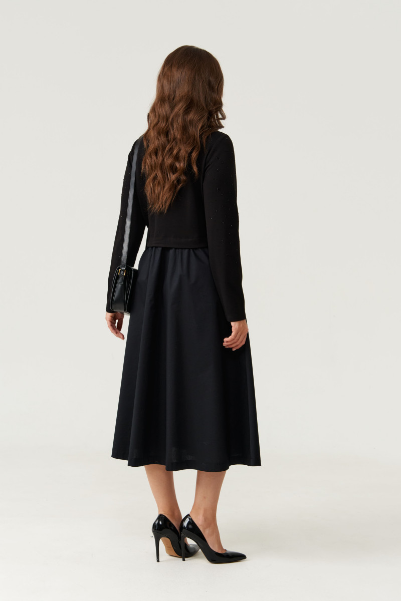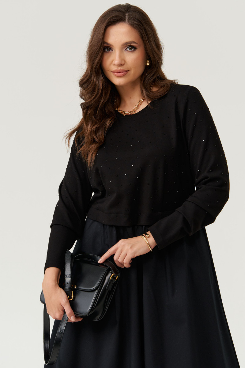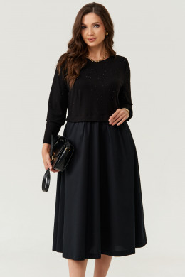Платье женское из смесовой ткани для повседневной носки. Платье отрезное по линии талии с имитацией джемпера. Лиф переда имеет две нагрудные вытачки. Юбка платья, расширенная к низу. Низ юбки из другого материала. Переднее полотнище юбки имеет два кармана с листочкой и две складки, а также средний шов. Заднее полотнище юбки имеет небольшую сборку по линии талии. В боковых швах по низу изделия имеется вставка на резинке. Горловина чуть расширенная. Рукава втачные, длинные. Длина платья миди. Стильное платье черного оттенка станет отличным вариантом для вашего времяпровождение. В данном платье вам будет очень комфортно, а также оно отлично будет выглядеть на любой фигуре.