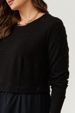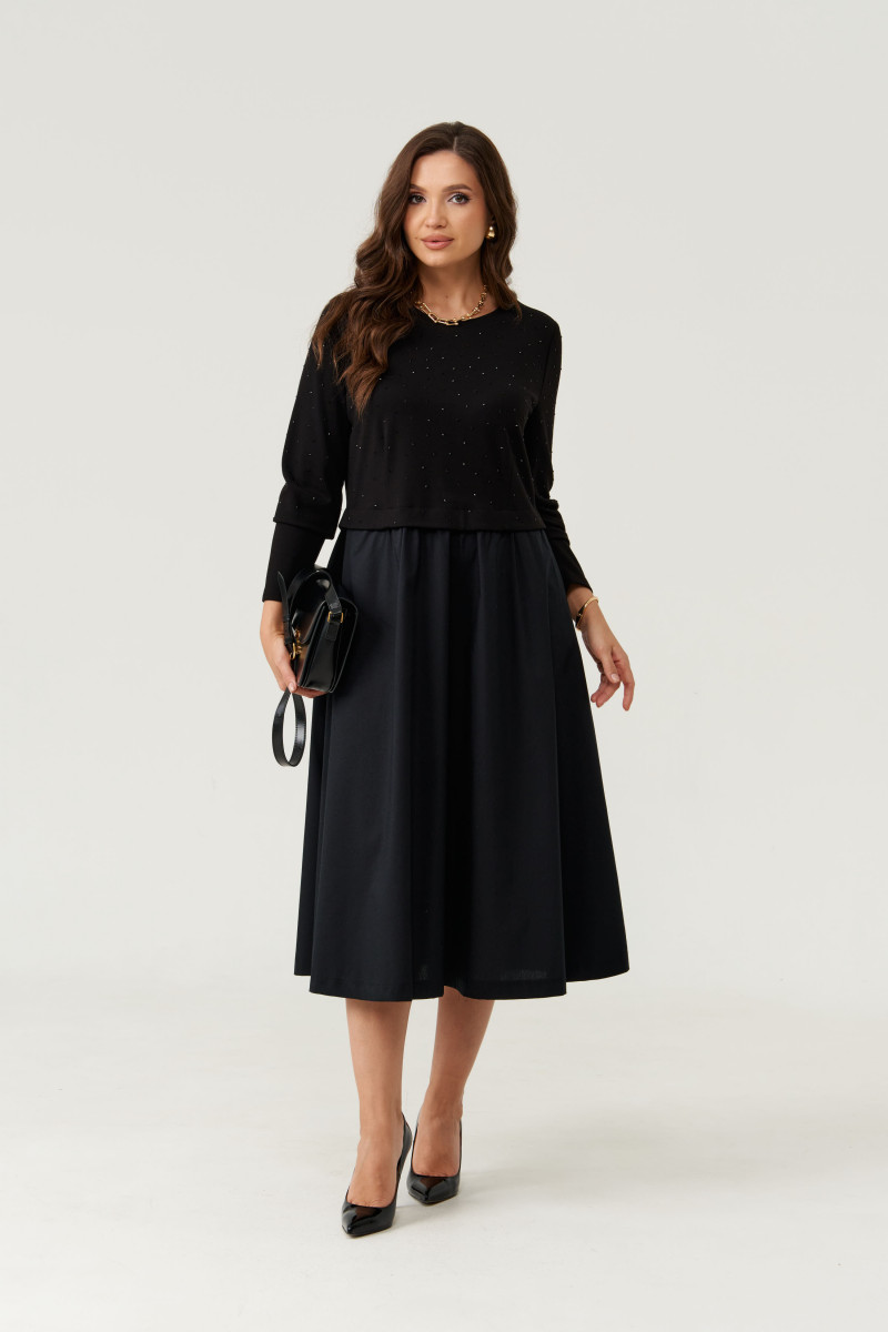 Платье женское из смесовой ткани для повседневной носки. Платье отрезное по линии талии с имитацией джемпера. Лиф переда имеет две нагрудные вытачки. Юбка платья, расширенная к низу. Низ юбки из другого материала. Переднее полотнище юбки имеет два кармана с листочкой и две складки, а также средний шов. Заднее полотнище юбки имеет небольшую сборку по линии талии. В боковых швах по низу изделия имеется вставка на резинке. Горловина чуть расширенная. Рукава втачные, длинные. Длина платья миди. Стильное платье черного оттенка станет отличным вариантом для вашего времяпровождение. В данном платье вам будет очень комфортно, а также оно отлично будет выглядеть на любой фигуре.