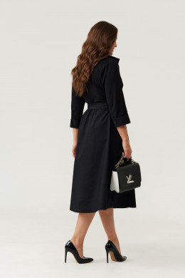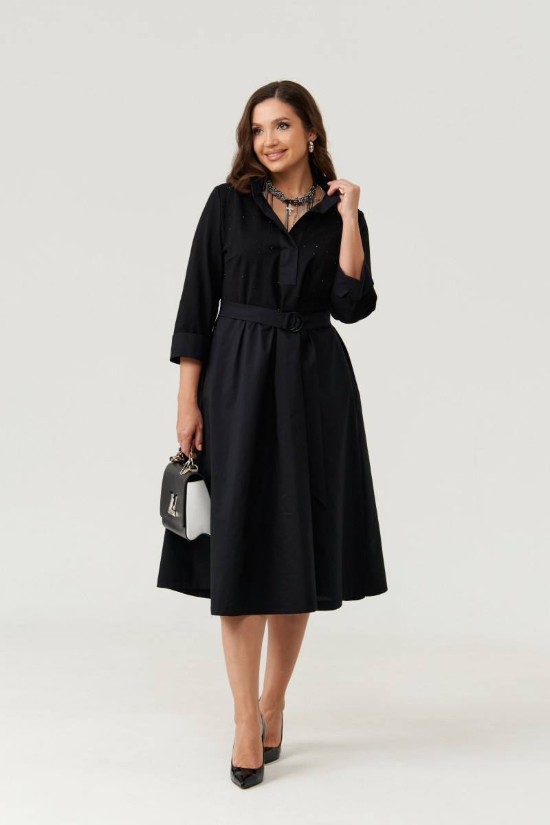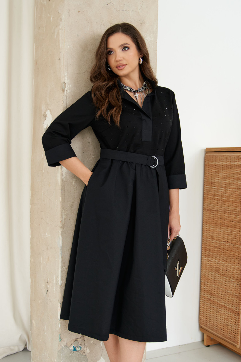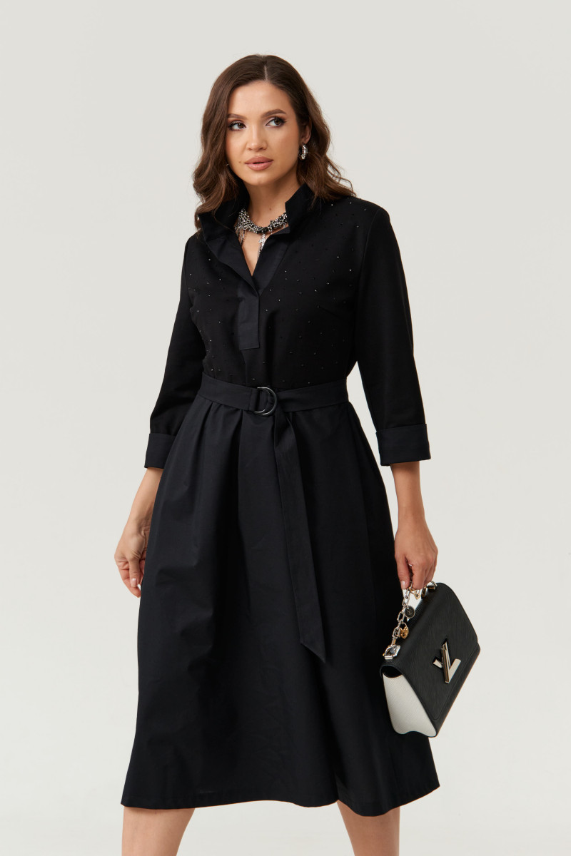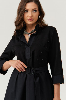 Платье женское из смесовой ткани для повседневной носки. Платье отрезное по линии талии с небольшой сборкой. Лиф переда украшен декоративными стразами, что придаёт данному платье определенный шарм. Лиф переда имеет две нагрудные вытачки. Юбка платья, расширенная к низу. Низ юбки из другого материала. В боковых швах имеются потайные карманы. Горловина обработана планкой в нахлест из другой ткани, горловина V-образная. Рукава втачные, длинные, низ рукава обработан отлетной манжетой из другой ткани. Платье с регулирующим поясом, за счет чего вы можете регулировать область прилегания в талии. Длина платья миди. Стильное платье черного оттенка станет отличным вариантом для вашего времяпровождение. В данном платье вам будет очень комфортно, а также оно отлично будет выглядеть на любой фигуре.