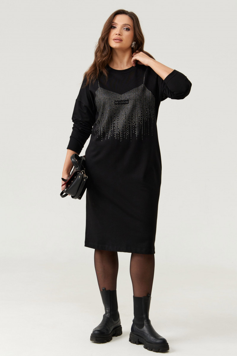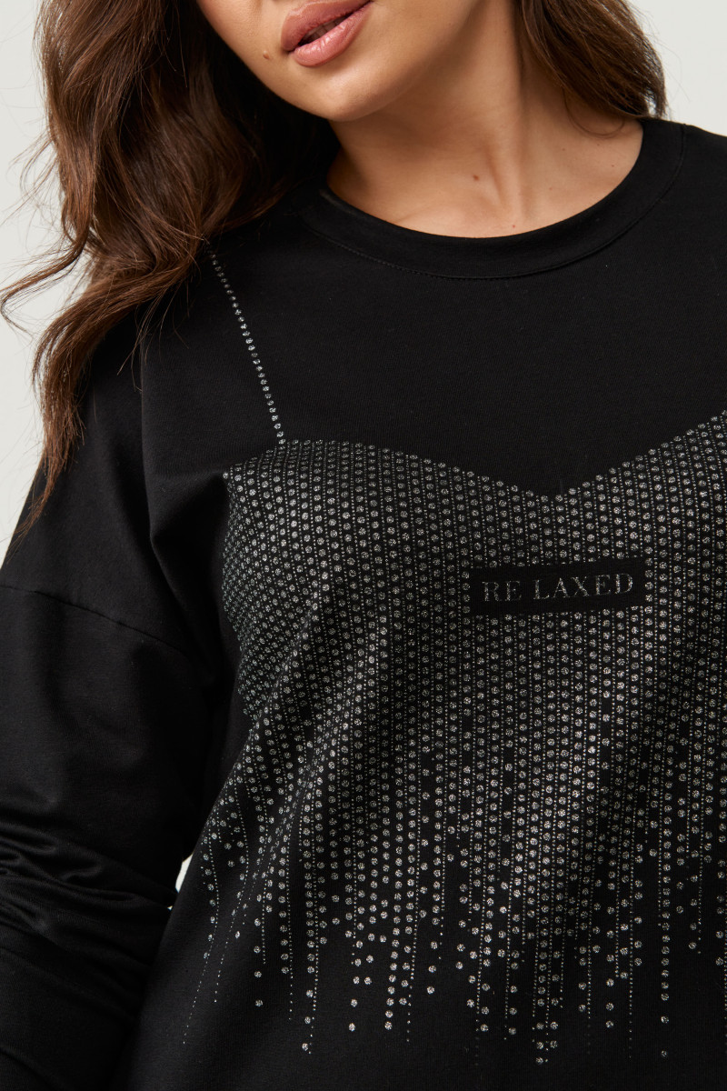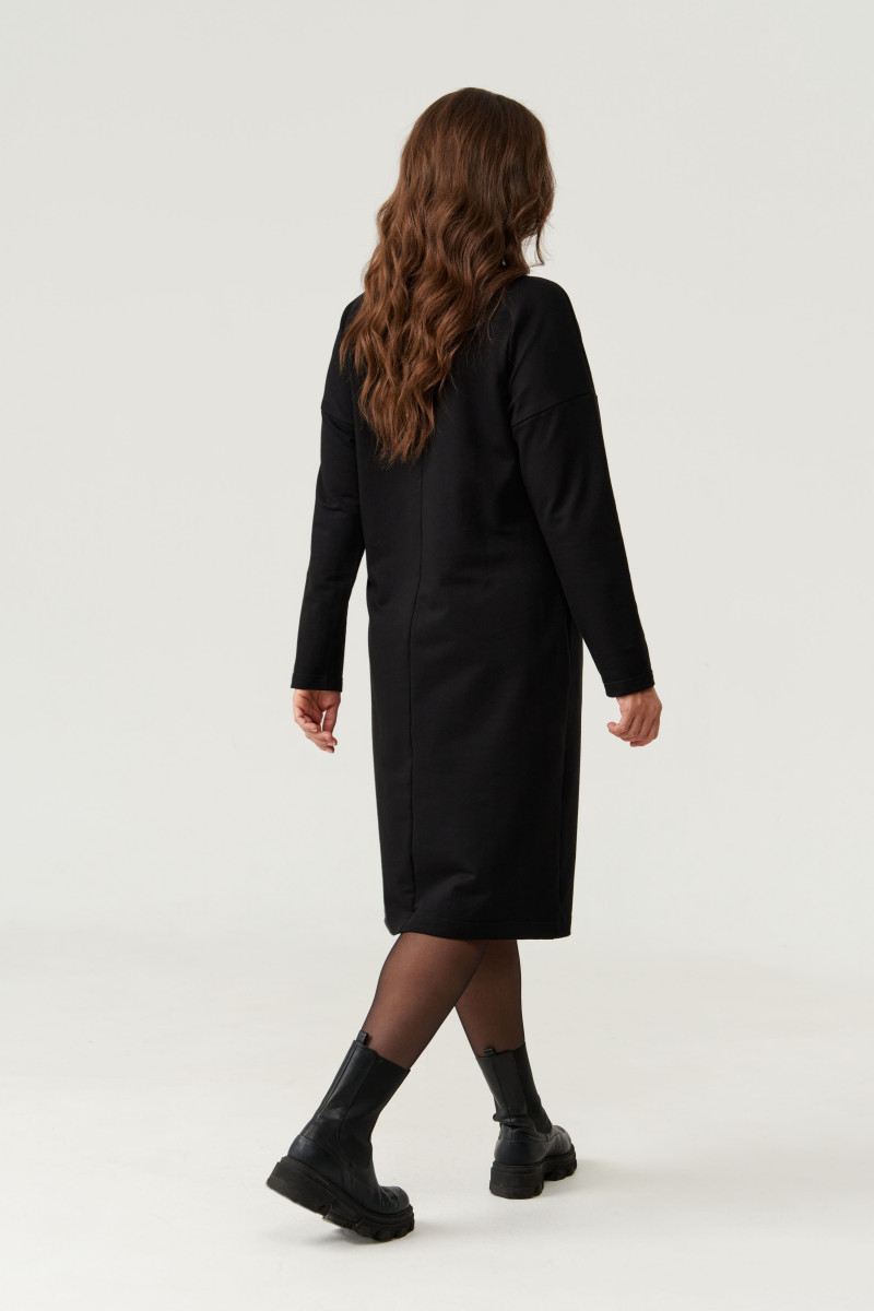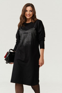 Платье женское из смесовой ткани с большим содержанием хлопка для повседневной носки. Перед украшен дизайнерской печатью и декоративными стразами, что придаёт данному платье определенный шарм. Перед с имитацией рельефов, идущих от проймы и сводятся на нет чуть ниже линии талии. Спинка со средним швом и потайной застежкой молнией в шве и застежкой капелькой на петли пуговицы. Спинка имеет две талиевые вытачки. В среднем шве располагается шлица. Горловина V-образная. Рукава втачные из струящейся ткани, длинные, низ рукава обработан притачной манжетой с застежкой на обметанные петли и пуговицы. Длина платья миди. Стильное платье черного оттенка станет отличным вариантом для вашего времяпровождение. В данном платье вам будет очень комфортно, а также оно отлично будет выглядеть на любой фигуре. В данном платье вы создадите неотразимы образ, который покорит всех своей утонченностью.