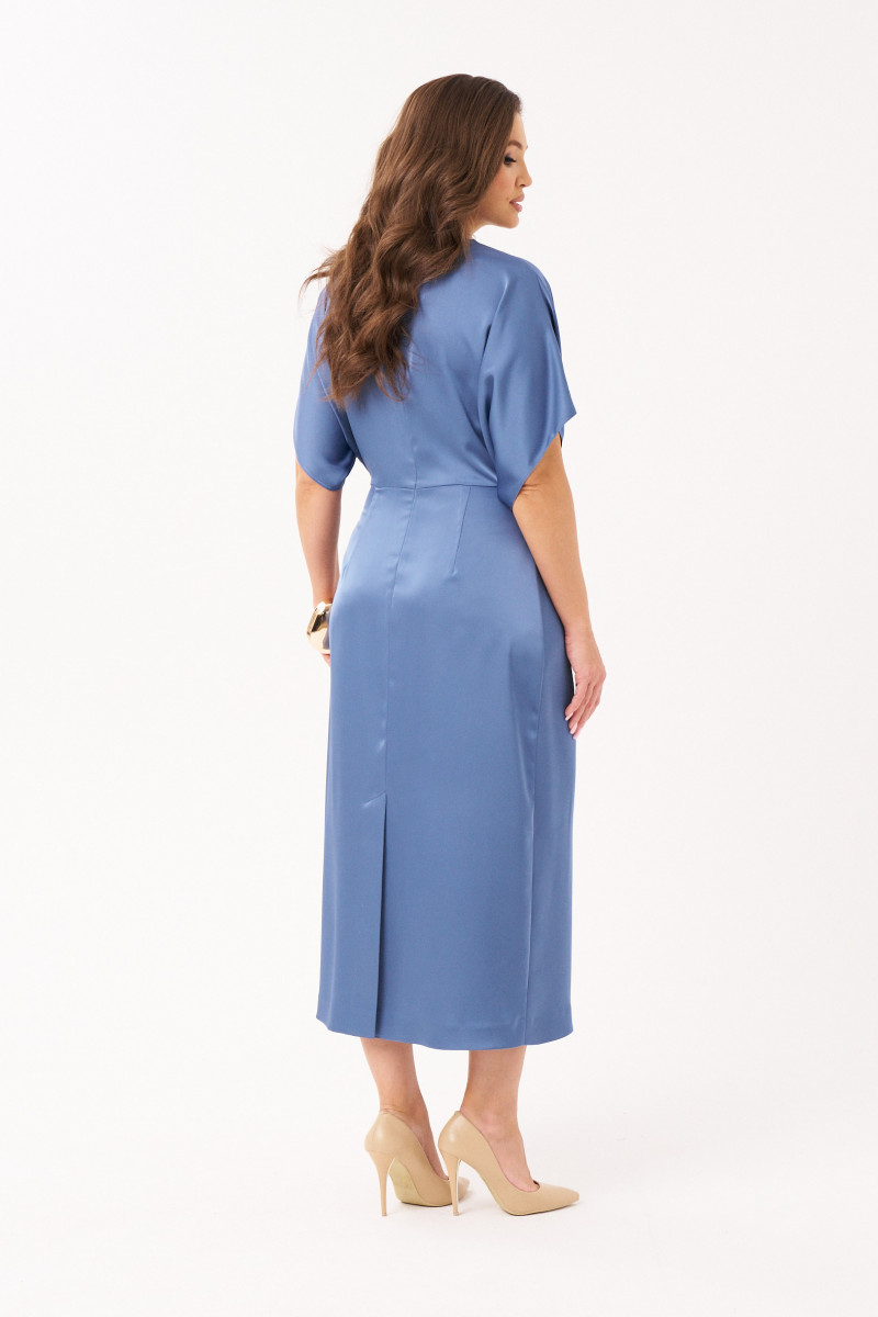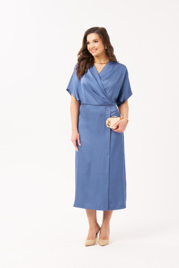Платье женское из струящейся ткани с блеском для повседневной и торжественной носки. Платье полуприлегающего силуэта. Платье отрезное по линии талии. Лиф переда имеет средний шов и складки. Лиф спинки имеет складки и средний шов с потайной застежкой молнией. Горловина V-образная. Рукава цельнокроеные, короткие. Линия плеча чуть спущена. Юбка платья, расширенная к низу. Переднее полотнище юбки имеет складки. Заднее полотнище юбки со средним швом и вытачками. Платье длиной макси. Элегантное платье в тёмно-голубом цвете прекрасный вариант для торжественного случая.