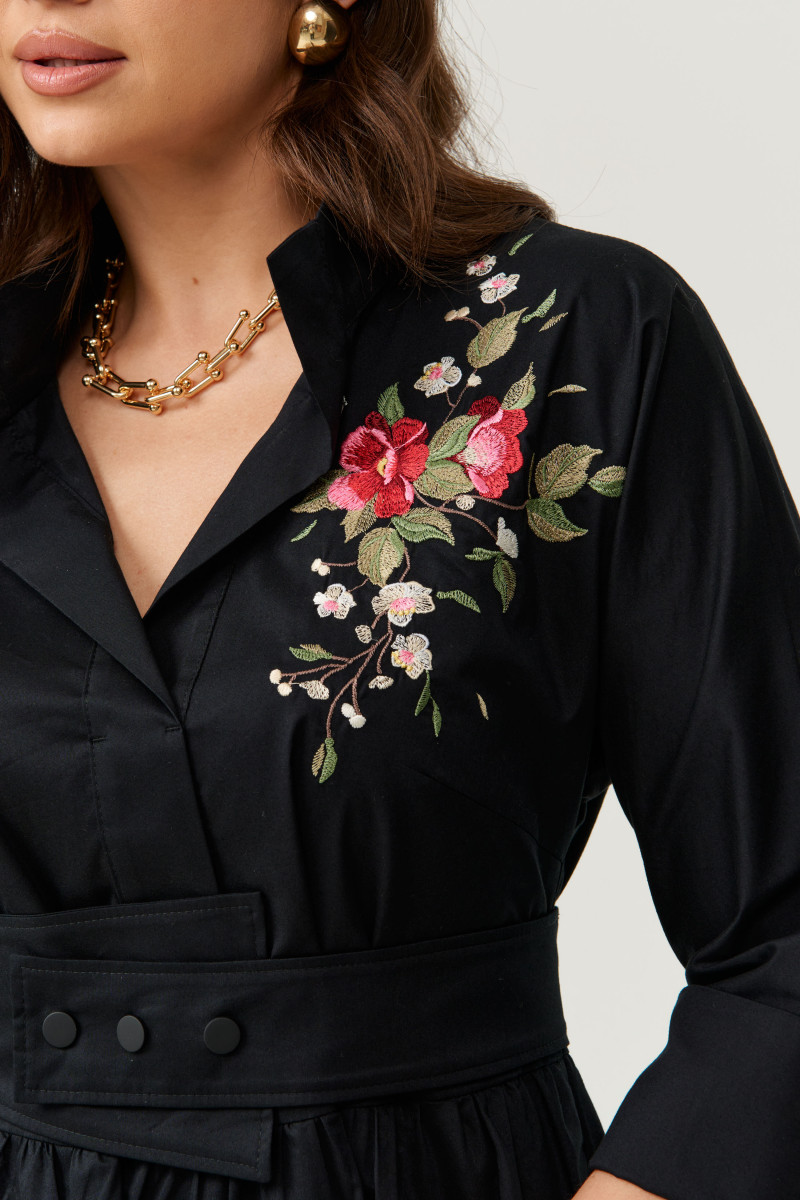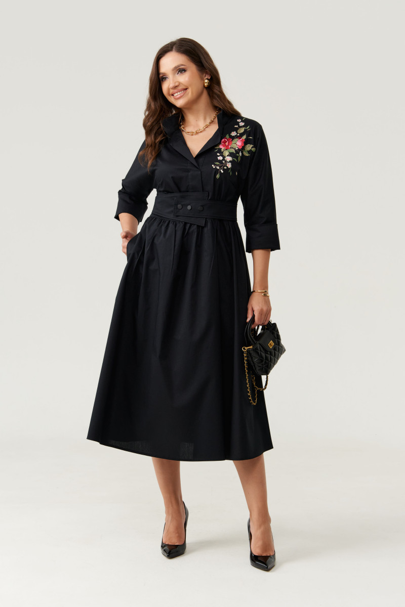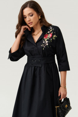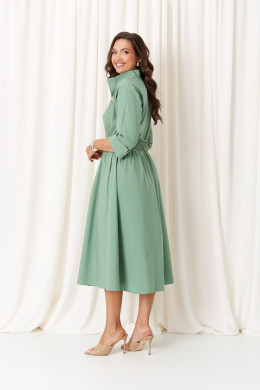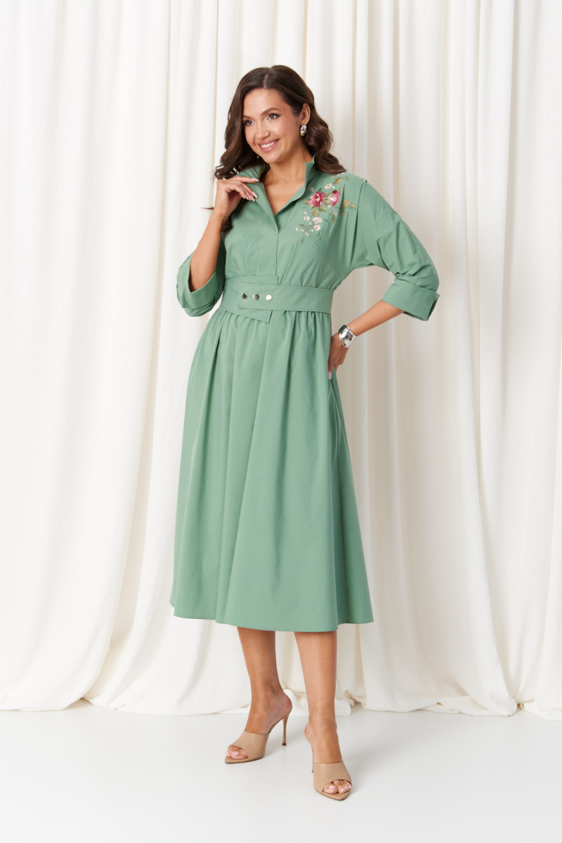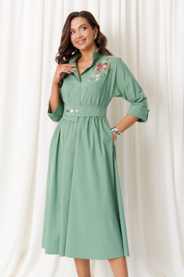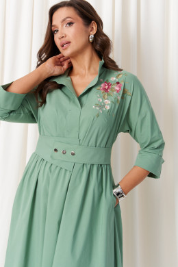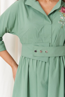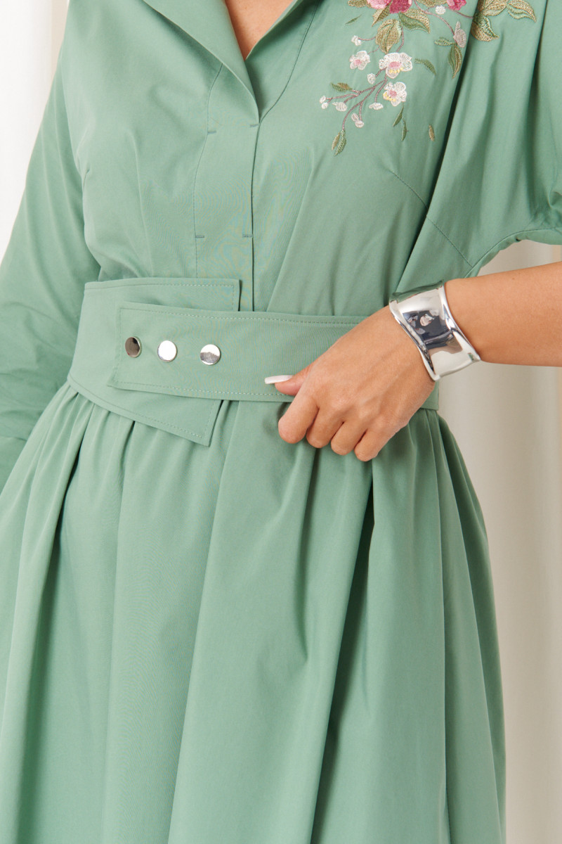 Платье женское из хлопковой ткани для повседневной носки. Без подкладки. Платье полуприлегающего силуэта. Платье отрезное по линии талии и имеет небольшую сборку. Перед имеет две нагрудные вытачки, а также дизайнерскую вышивку в виде веточки с цветочками. В боковых швах располагаются прорезные карманы. Горловина обработана втачной планкой с нахлестом в V-образной горловине, а также воротником-стойкой. Рукава втачные, длиной. ниже локтя. Низ рукава обработан отлетной манжетой. Юбка платья расширенная. Платье укомплектовано поясом из основной ткани изделия. Пояс со вставкой на резинке, застежка на кнопки. Длина изделия миди. Данное платье оливкового оттенка станет незаменимой вещью в вашем гардеробе, оно отлично будет сидеть и смотреться на любой фигуре.