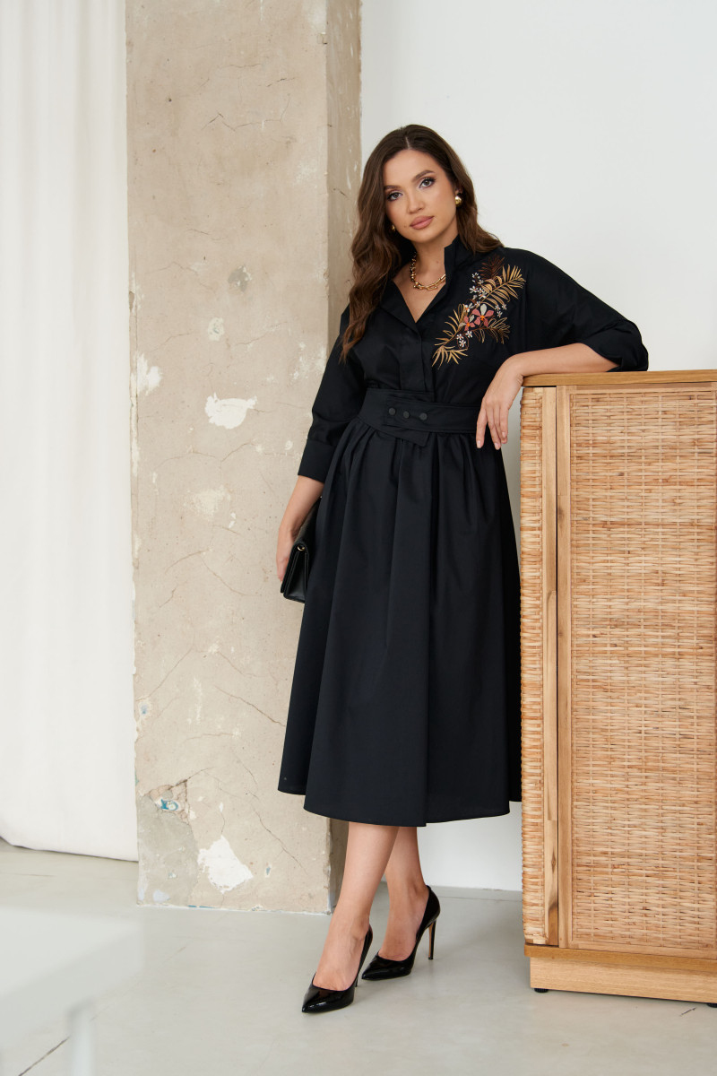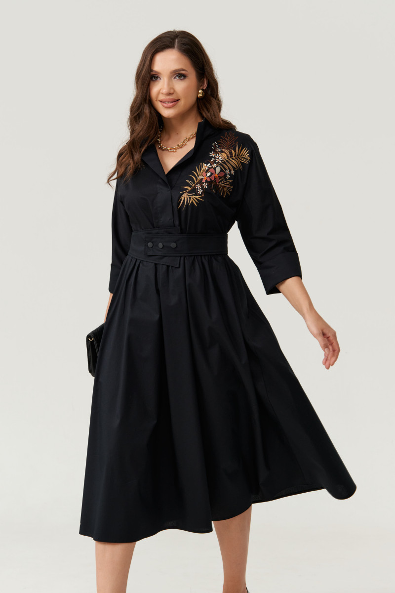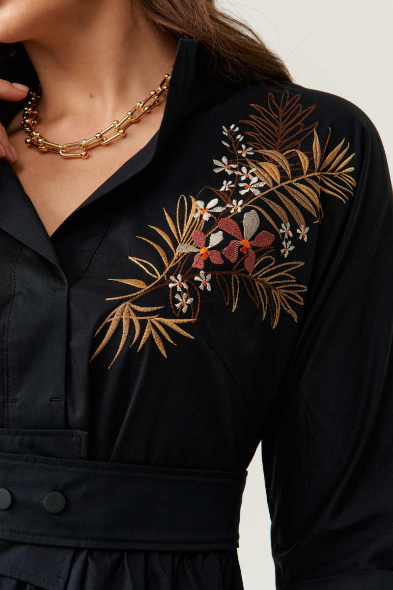Платье женское из хлопковой ткани для повседневной носки. Без подкладки. Платье полуприлегающего силуэта. Платье отрезное по линии талии и имеет небольшую сборку. Перед имеет две нагрудные вытачки, а также дизайнерскую вышивку в виде веточек с цветочками. В боковых швах располагаются прорезные карманы. Горловина обработана втачной планкой с нахлестом в V-образной горловине, а также воротником-стойкой. Рукава втачные, длиной. ниже локтя. Низ рукава обработан отлетной манжетой. Юбка платья расширенная. Платье укомплектовано поясом из основной ткани изделия. Пояс со вставкой на резинке, застежка на кнопки. Длина изделия миди. Данное платье черного оттенка станет незаменимой вещью в вашем гардеробе, оно отлично будет сидеть и смотреться на любой фигуре.
