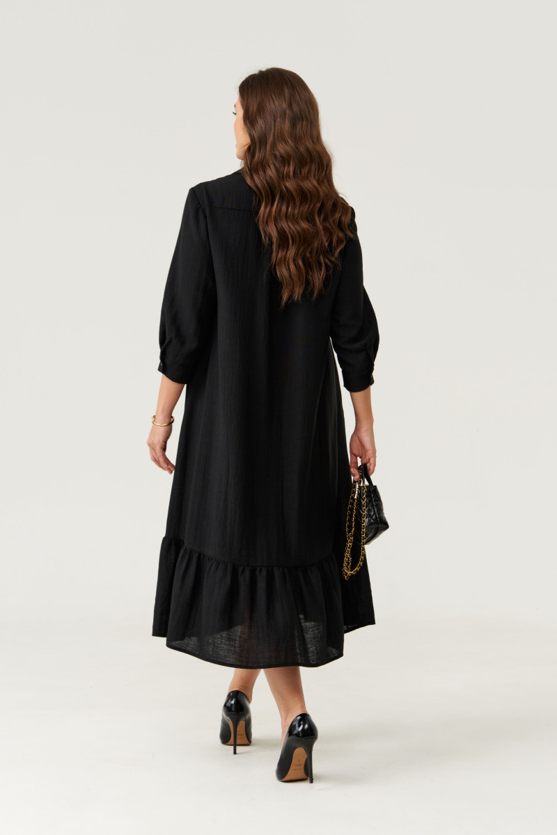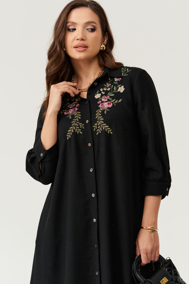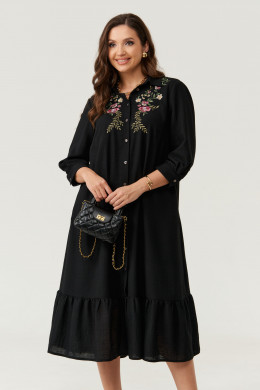 Платье женское из лёгкой ткани для повседневной носки. Платье расширенного силуэта. Горловина оформлена воротником стойкой. Рукав 3/4, низ рукава оформлен манжетой, застёгивающаяся на петлю-пуговицу. На передней части изделия дизайнерская вышивка с цветочным мотивом. Спинка с отрезной кокеткой, по шву сборка. Изделие с фронтальной застежкой на петли- пуговицы. По низу платья отрезной ярус на сборке. Платье на вискозной подкладке.