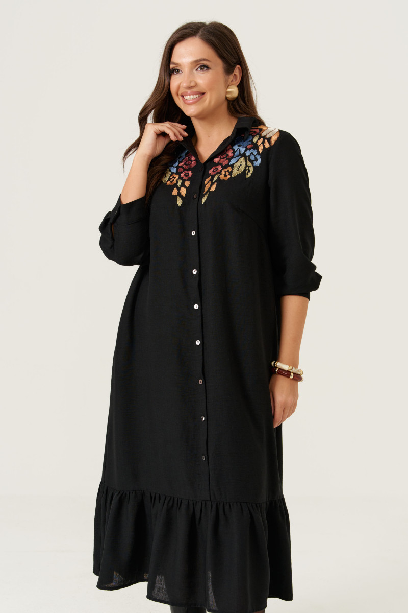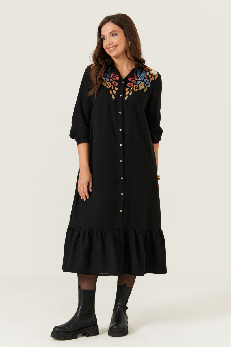 Платье женское из лёгкой ткани для повседневной носки. Платье расширенного силуэта. Горловина оформлена воротником стойкой. Рукав 3/4, низ рукава оформлен манжетой, застёгивающаяся на петлю-пуговицу. На передней части изделия дизайнерская вышивка в виде мозайки. Спинка с отрезной кокеткой, по шву сборка. Изделие с фронтальной застежкой на петли- пуговицы. По низу платья отрезной ярус на сборке. Платье на вискозной подкладке.