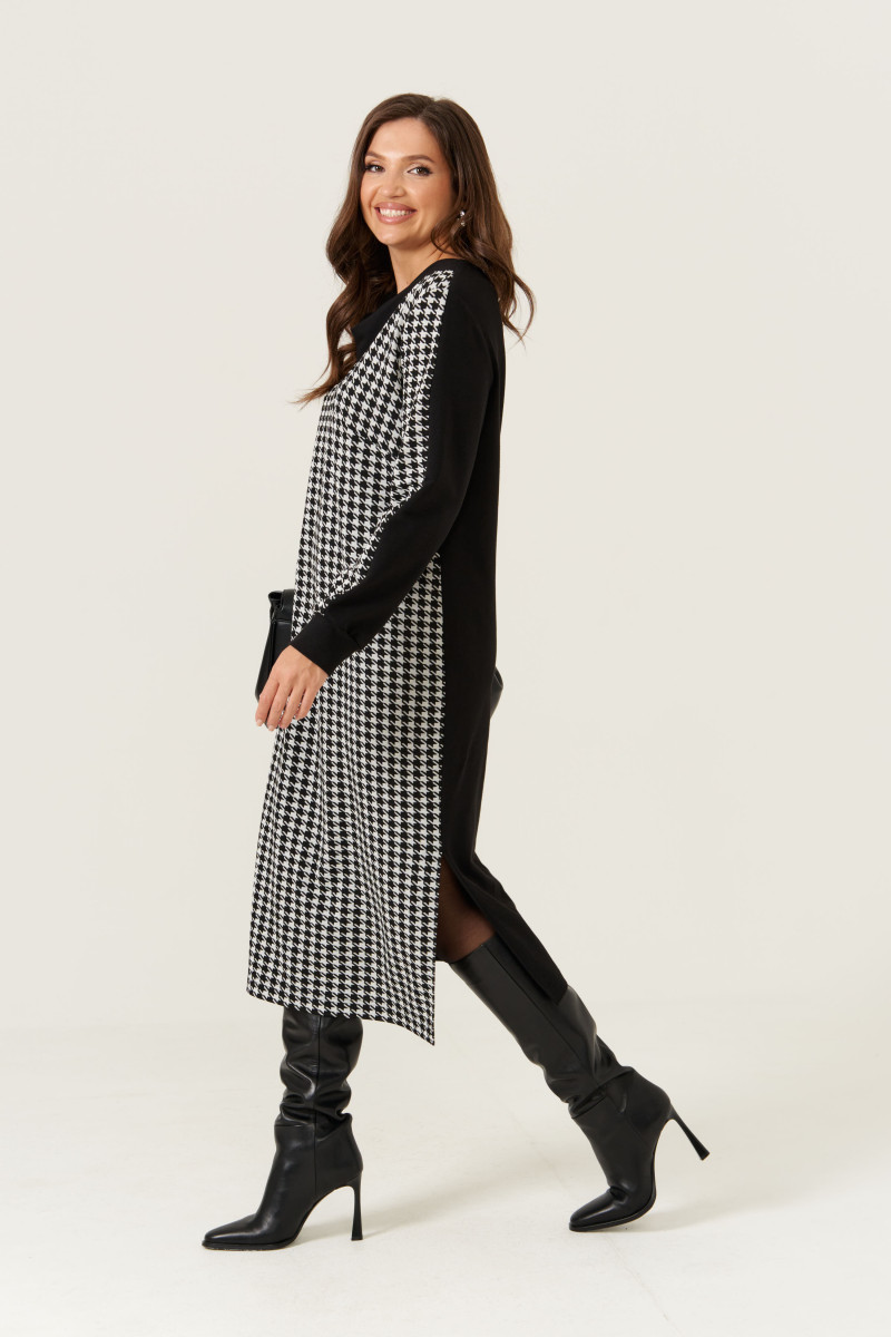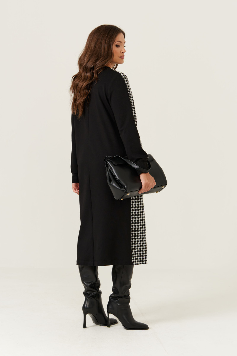 Женское платье из трикотажного полотна, идеально подходящее для повседневной носки. Модель выполнена с передом из черно-белого трикотажного материала, что создает стильный и современный образ. Передняя часть украшена подрезом от горловины в боковом шве и двумя нагрудными вытачками, которые подчеркивают фигуру и добавляют интересные детали к дизайну. Спинка со средним швом выполнена в черном цвете, что гармонично сочетается с передом и создает контрастный эффект. В боковых швах расположены разрезы, обеспечивающие комфорт и свободу движений. V-образная горловина обработана обтачкой, придающей аккуратность и завершенность neckline. Длинные втачные рукава выполнены из чёрного и чёрно-белого трикотажа: передняя часть рукава — из чёрно-белого материала, задняя — из чёрного, что создает интересный визуальный эффект. Низ рукава обработан притачной манжетой для плотного прилегания. Длина платья — макси, что делает его элегантным и универсальным вариантом для повседневных образов.