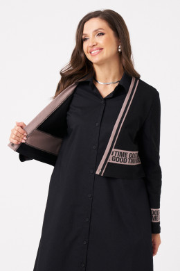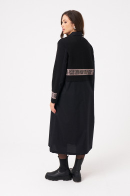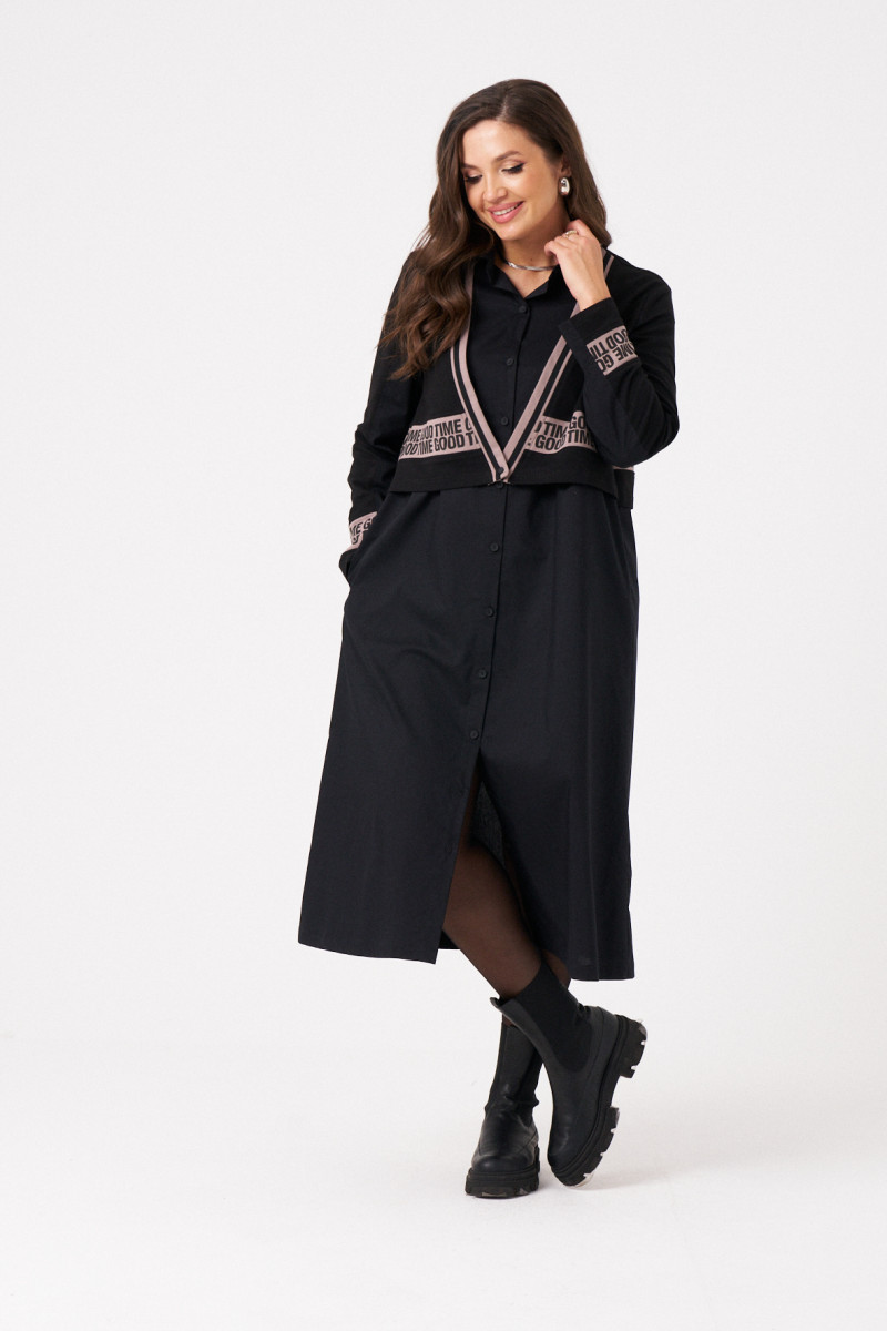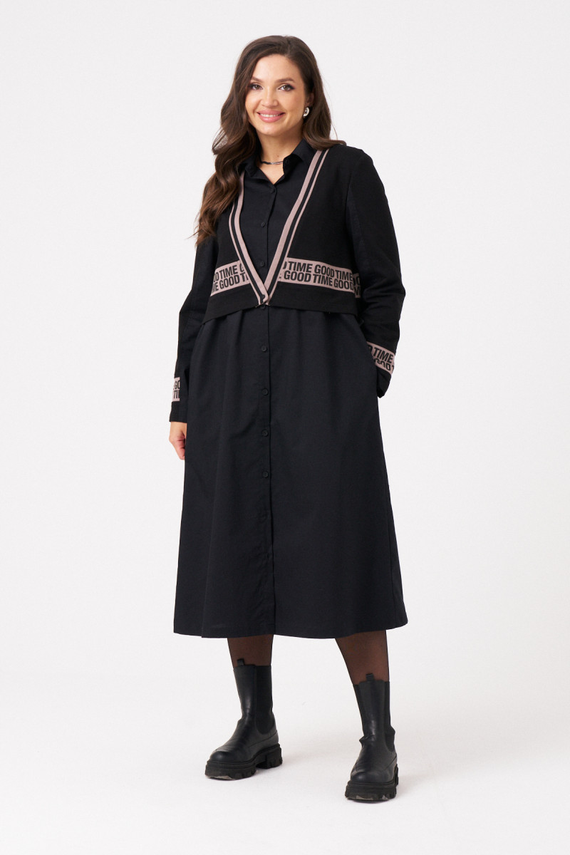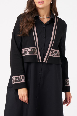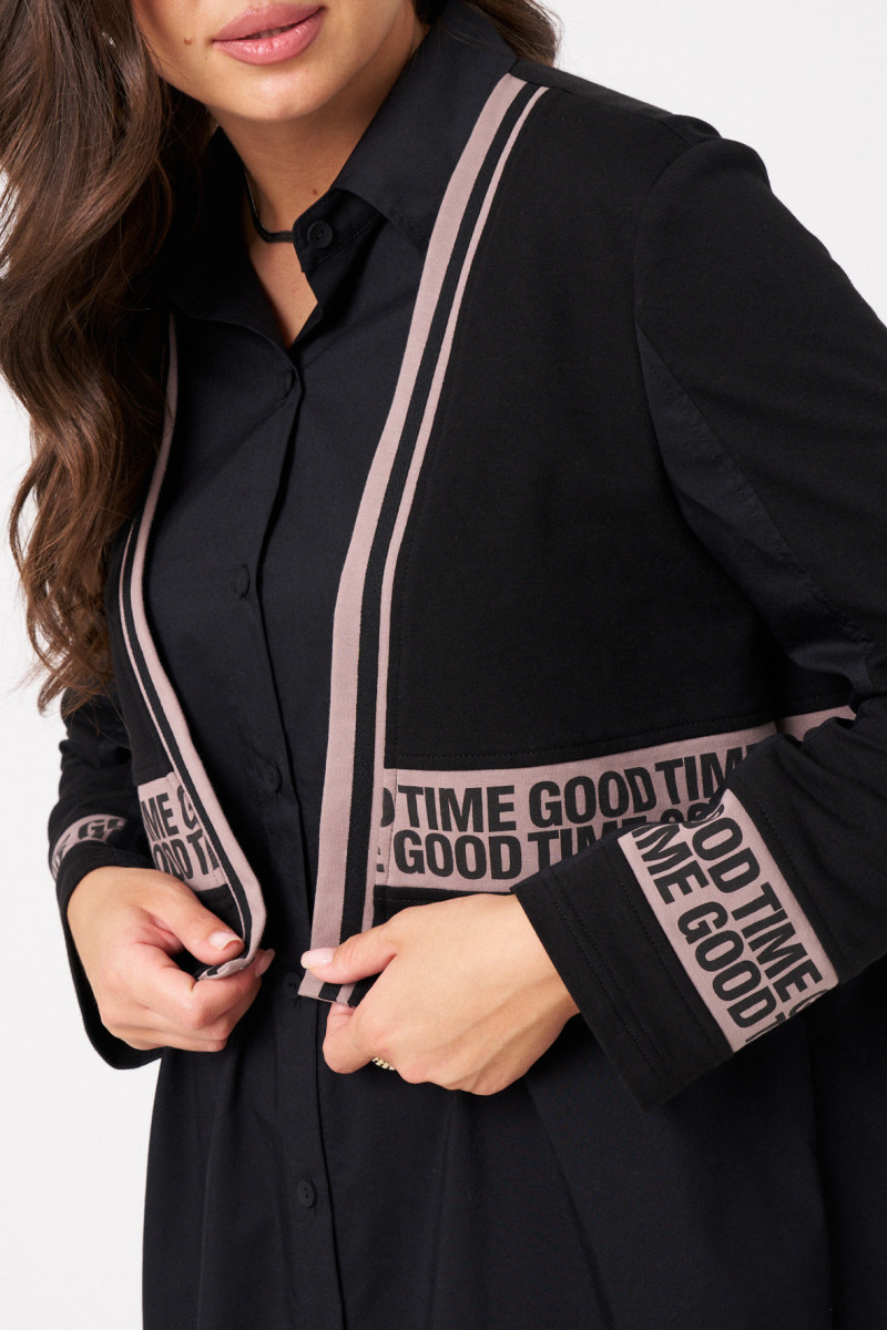Это женское платье из смесовой ткани с высоким содержанием хлопка, что обеспечивает комфорт и приятные тактильные ощущения. Застежка расположена по центральной бортовой линии, выполнена на обметанных петлях и пуговицах, что придает изделию аккуратный и классический вид. Перед платья украшен притачной накидкой из трикотажного полотна с дизайнерской печатью в виде надписей, а также оснащен застежкой на кнопку. Аналогичная накидка расположена и на спинке, также украшена дизайнерской печатью, что создает гармоничный и стильный образ. Горловина обработана рубашечным воротником с отрезной стойкой, что добавляет изделию элегантности и структурированности. Рукава втачные длинные: верхний рукав выполнен из трикотажного полотна с дизайнерской печатью, а нижний — из смесовой ткани с высоким содержанием хлопка, это обеспечит комфорт, а стильный внешний вид за счет чёрного оттенка. Длина платья — макси, оно идеально подойдет для различных случаев, сочетая в себе комфорт, стиль и оригинальный дизайн.