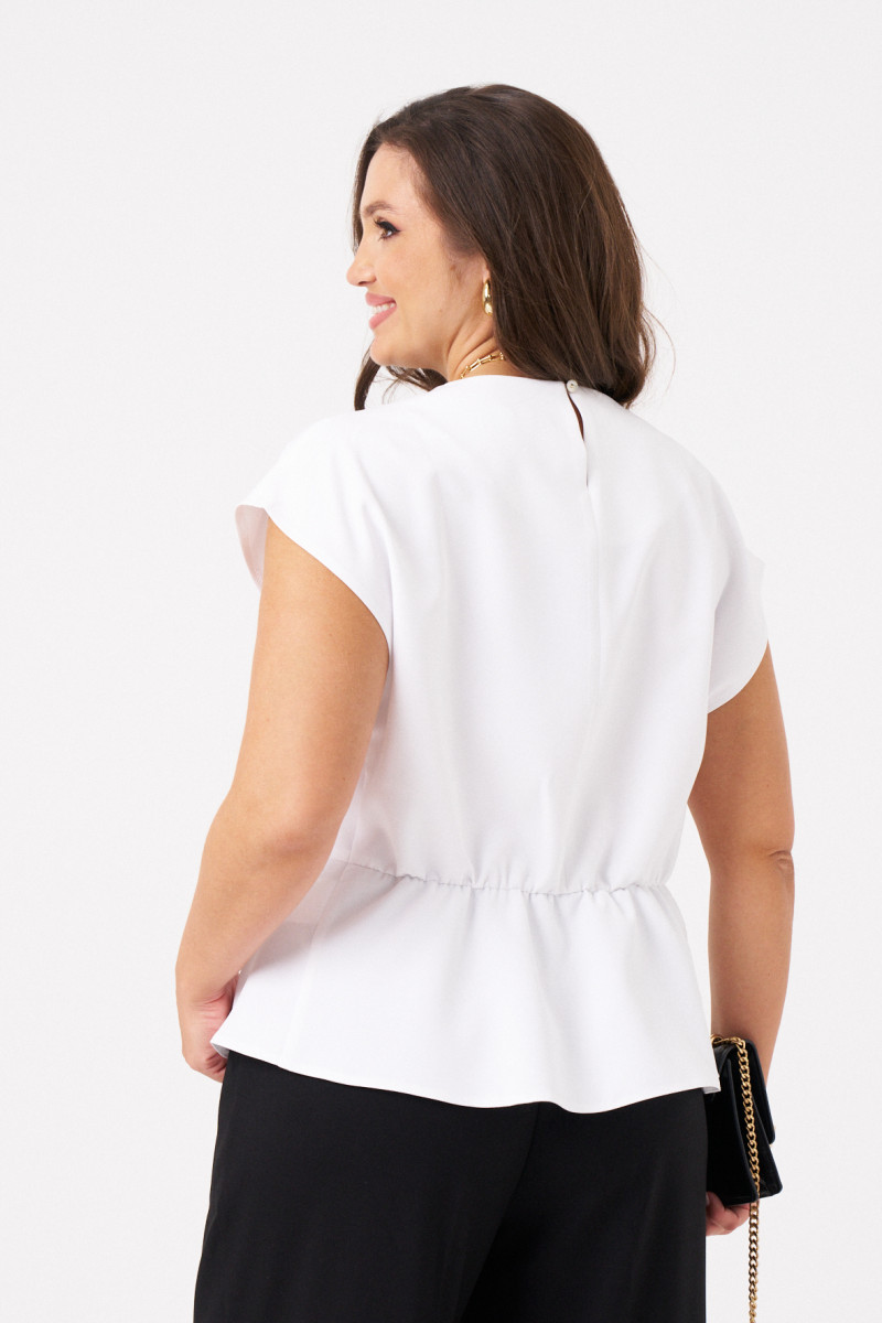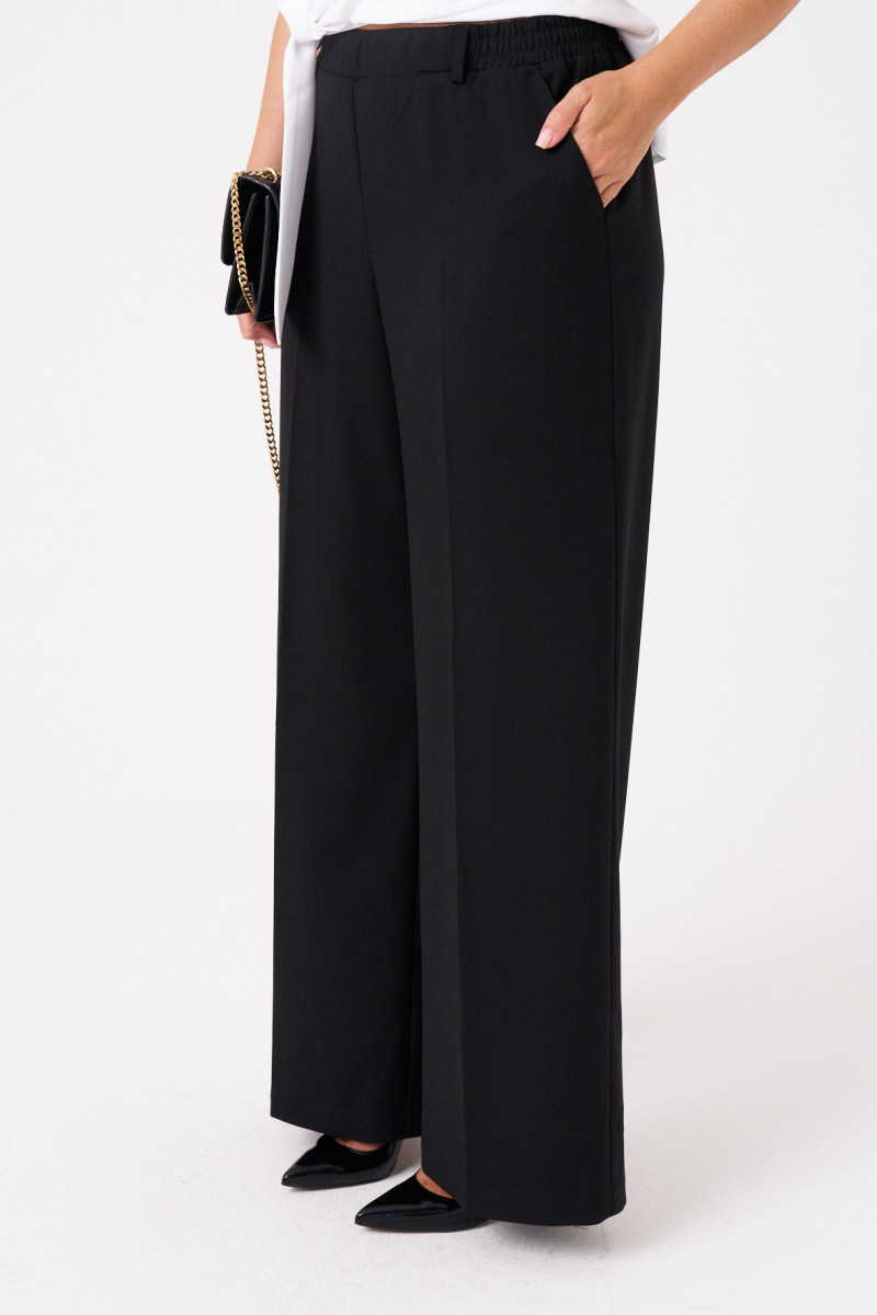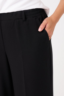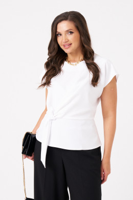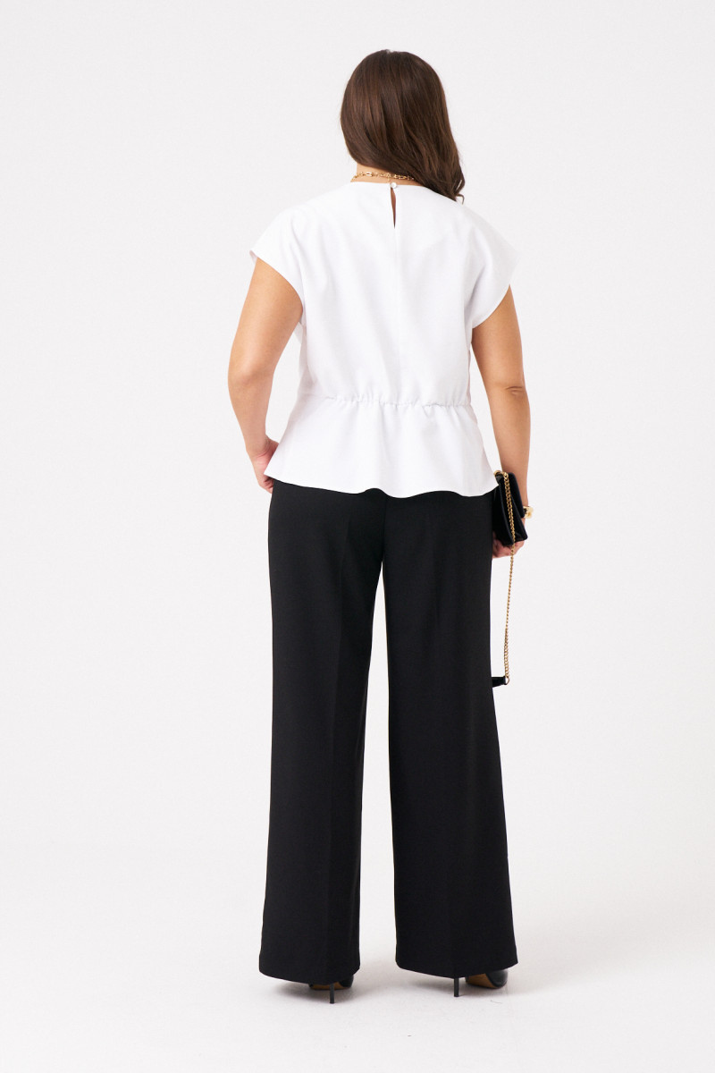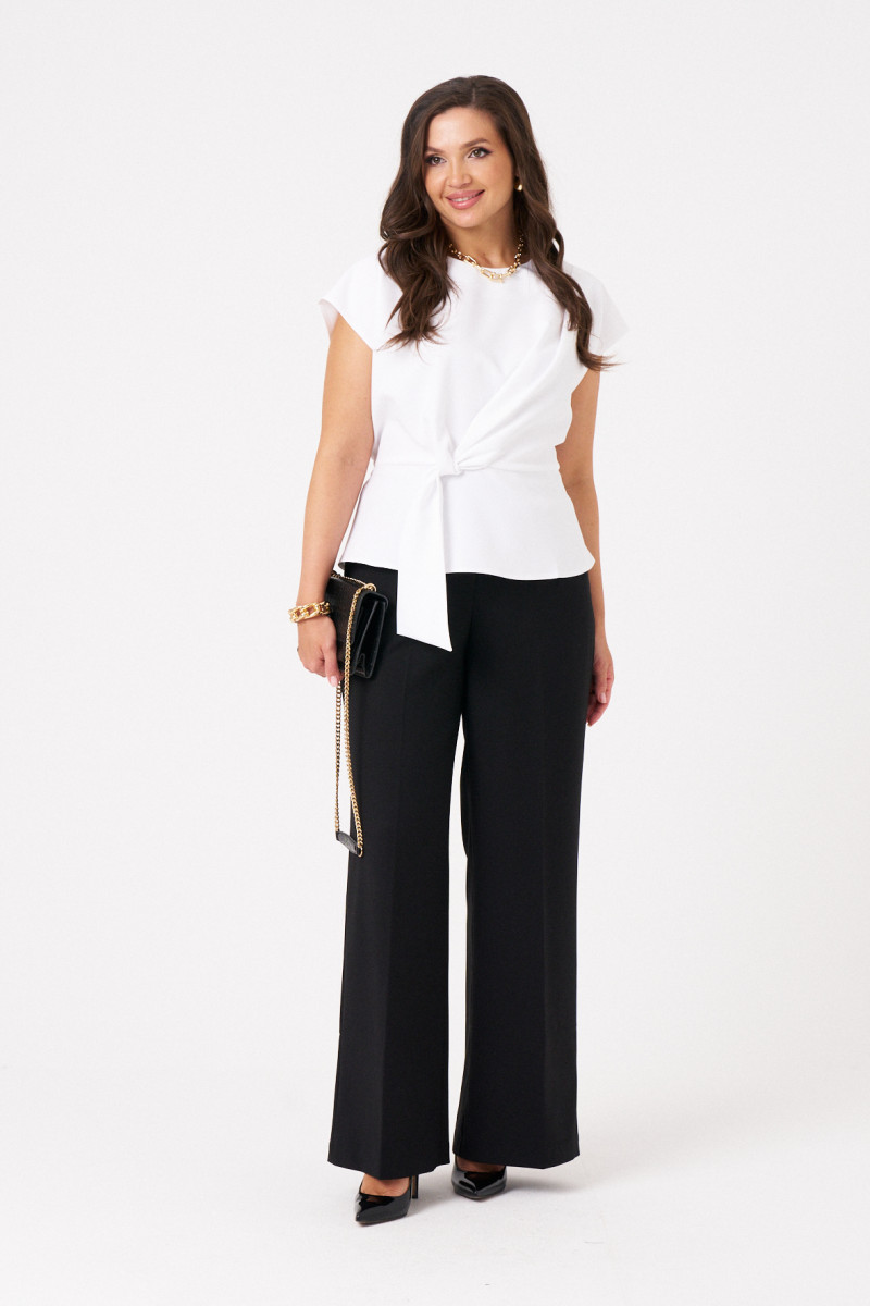 Этот женский костюм сделан в молочно-чёрных оттенках, костюм состоит из блузки и элегантных брюк, идеально подходящих как для повседневных, так и для торжественных мероприятий. Блузка выполнена из мягкой смесовой ткани, имеет оригинальный дизайн с отрезной нижней частью, декоративной складкой по плечевому шву и дизайнерским узлом на передней части. Горловина круглая, рукава цельнокроеные, а вставка на резинке по линии талии создает легкую сборку, подчеркивающую фигуру. Спинка украшена средним швом и застежкой-капелькой с пуговицей. Эта блузка отлично сидит и привлекает внимание своим уникальным стилем. Брюки из поливискозной ткани имеют прямой силуэт и приталенный пояс, который подчеркивает фигуру. Верхняя часть обработана поясом-обтачкой с дизайнерским принтом внутри. Задние карманы-обманки в рамке с обтачками добавляют изящества, а боковые прорезные карманы делают модель практичной. Застежка — крючок и тесьма-молния в среднем шве. Передние и задние части заутюжены на кант, что придает аккуратный вид. Полоска по бокам визуально удлиняет силуэт, делая образ более стройным и элегантным. Этот костюм подчеркнет вашу индивидуальность, создаст уверенный и современный образ, подходящий для различных случаев.