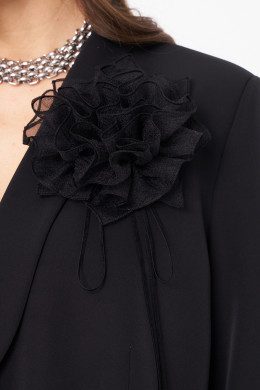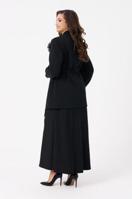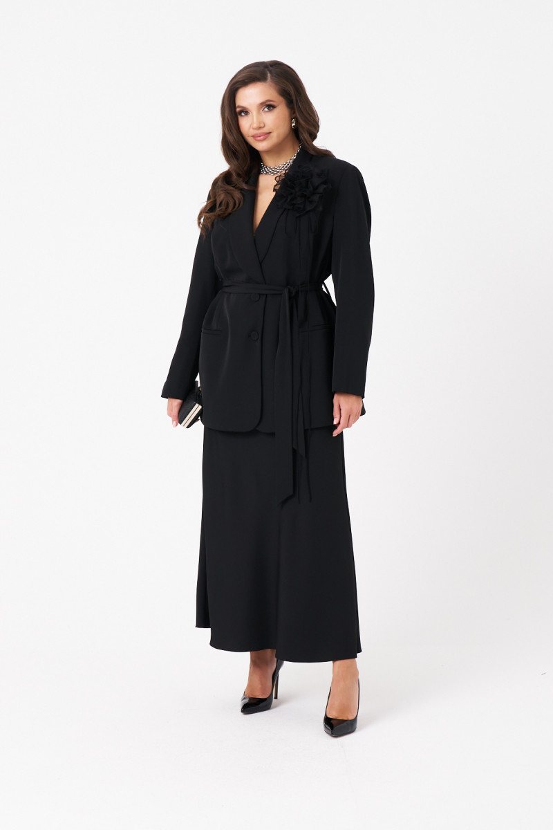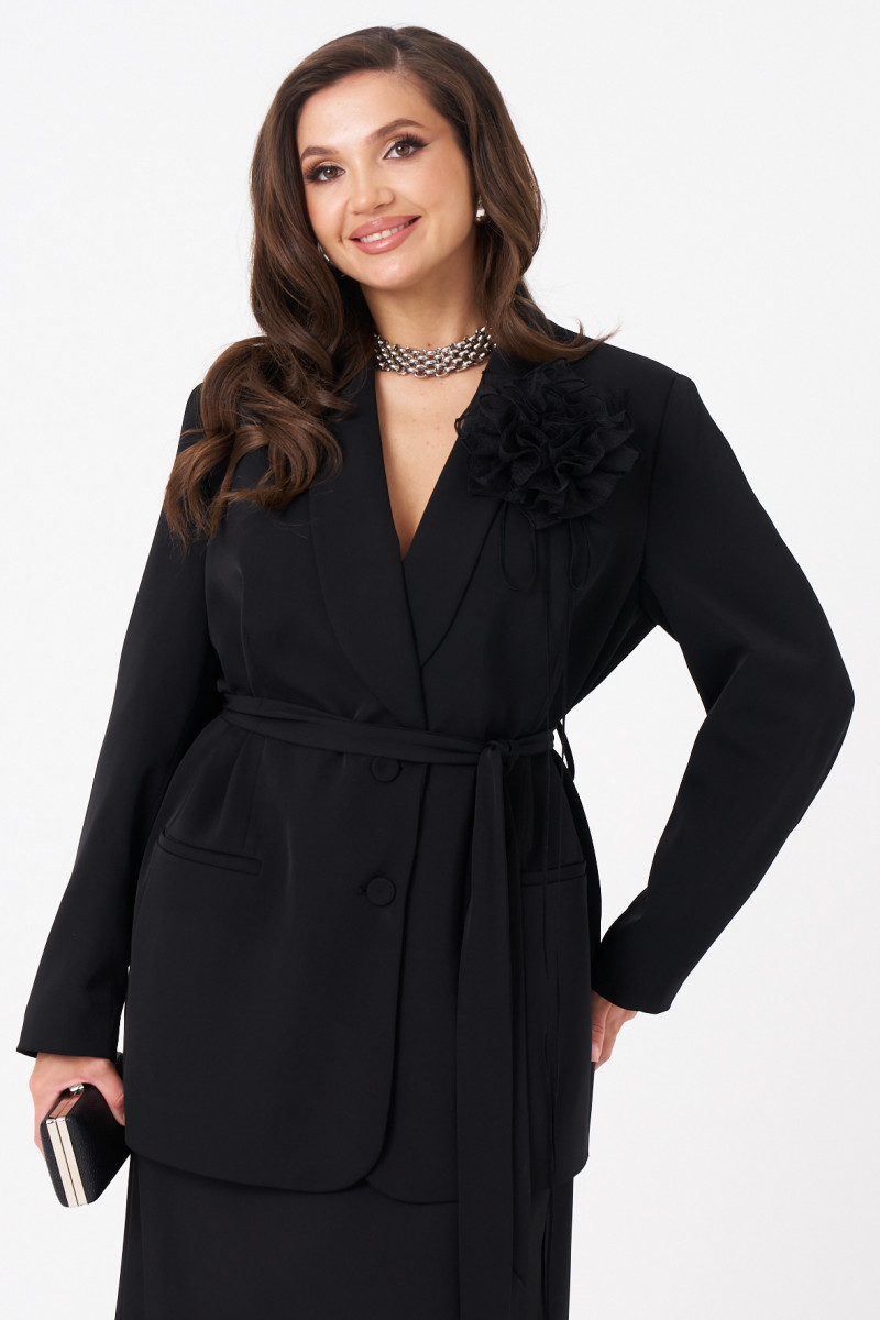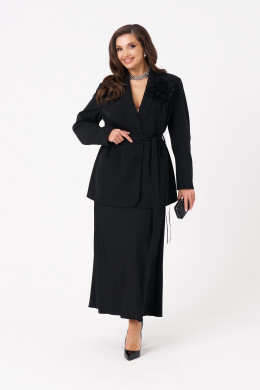 Женский костюм для повседневной или торжественной носки состоит из жакета и юбки, выполненный из мягкой поливискозной ткани. Жакет украшен двумя талиевыми вытачками, двумя карманами с листочкой и застежкой на пуговицы по центральному краю. Спинка оформлена со средним швом, воротник-шаль придает образу элегантность, а длинные втачные рукава делают модель универсальной. В области талии есть пояс из основной ткани, который можно продевать через шлевки для придания формы. В комплект входит декоративный цветок-чокер на завязке, который можно регулировать по длине или использовать как брошь, добавляя образу индивидуальности. Юбка выполнена из той же ткани, с подкладкой и вырезана по косой, что обеспечивает ей особую элегантность и хорошую посадку. Верхний срез юбки обработан потайной резинкой для удобства. Длина юбки по щиколотку. Юбка на вискозной подкладке. Этот костюм сочетает комфорт и стиль, подходит для различных случаев — от повседневных прогулок до торжественных мероприятий.