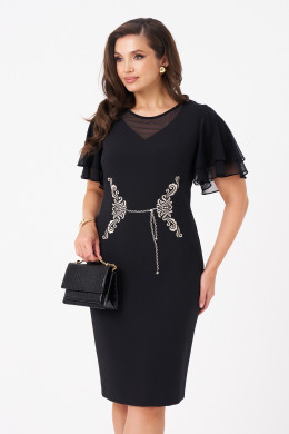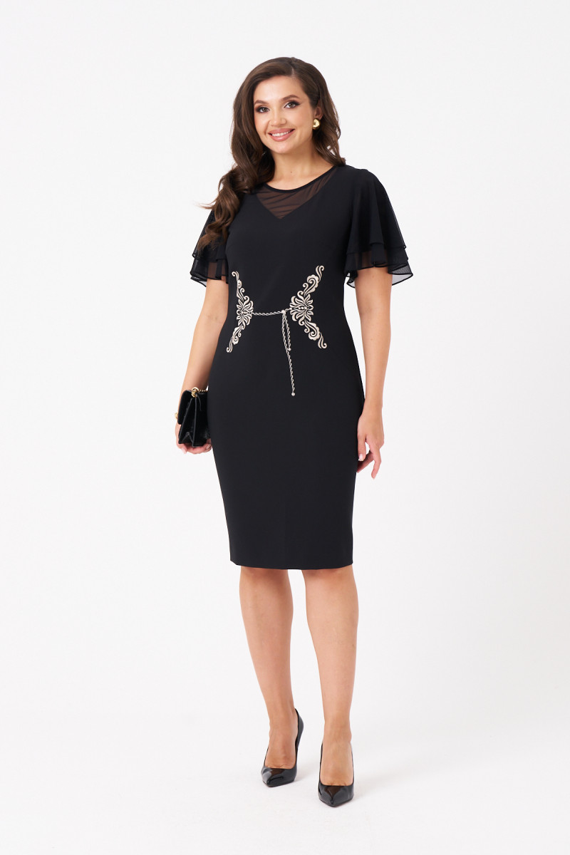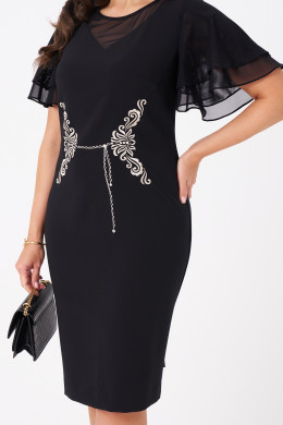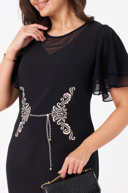 Это стильное платье чёрного оттенка полуприлегающего силуэта выполнено из мягкой и приятной на ощупь поливискозной ткани, идеально подходящей для ежедневных либо торжественных образов. Модель отличается элегантным кроем и оригинальными декоративными деталями. Передняя часть украшена двумя рельефами, идущими от проймы в боковой шов, создающими стройный силуэт. В области талии расположена вышивка, имитирующая пояс, что подчеркивает фигуру и добавляет изящности образу. Горловина оформлена V-образным вырезом с сетчатой вставкой, придающей образу легкую нотку романтики и изысканности. Спинка выполнена со средним швом и застежкой-молнией в шве, а также дополнена шлицей по низу для удобства движений. В области талии расположены две вытачки, подчеркивающие фигуру. Рукава втачные из сетки с короткими воланами создают нежный и женственный акцент. Такой дизайн делает платье универсальным для повседневных прогулок и встреч, сочетая комфорт с оригинальностью деталей.