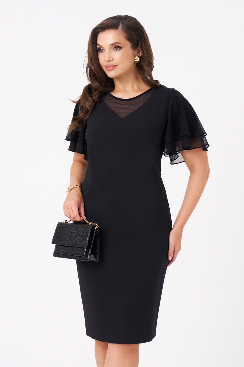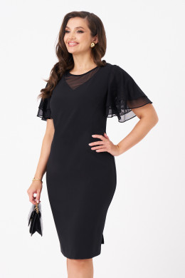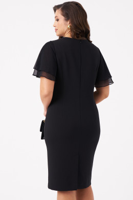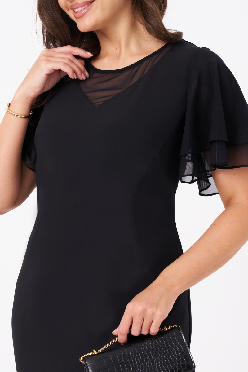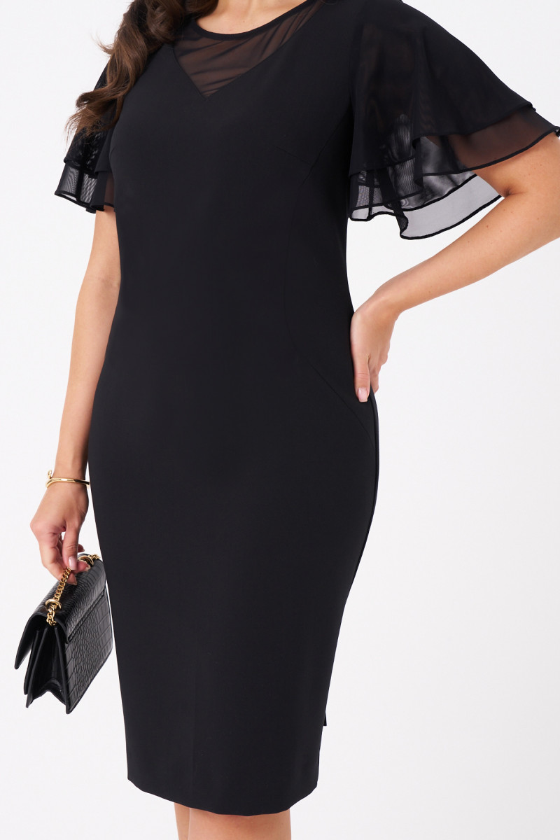 Это стильное платье чёрного оттенка полуприлегающего силуэта выполнено из мягкой и приятной на ощупь поливискозной ткани, идеально подходящей для ежедневных либо торжественных образов. Модель отличается элегантным кроем и оригинальными декоративными деталями. Передняя часть украшена двумя рельефами, идущими от проймы в боковой шов, создающими стройный силуэт. Горловина оформлена V-образным вырезом с сетчатой вставкой, придающей образу легкую нотку романтики и изысканности. Спинка выполнена со средним швом и застежкой-молнией в шве, а также дополнена шлицей по низу для удобства движений. В области талии расположены две вытачки, подчеркивающие фигуру. Рукава втачные из сетки с короткими воланами создают нежный и женственный акцент. Такой дизайн делает платье универсальным для повседневных прогулок и встреч, сочетая комфорт с оригинальностью деталей.