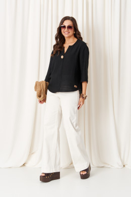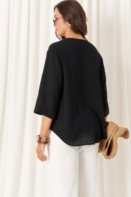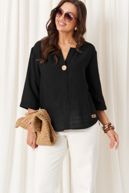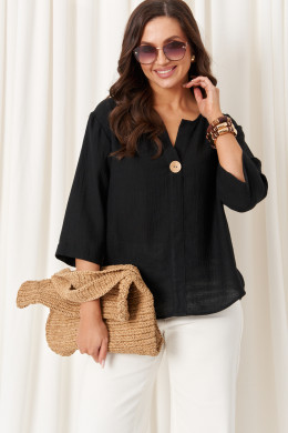 Блузка женская из хлопчатобумажной ткани прямого силуэта для повседневной носки. Перед имеет притачную планку до низа изделия с декоративной пуговицей, низ блузки полукруглый. Низ по спинке полукруглый и чуть длиннее чем перед. Горловина чуть расширена. Рукава втачные длинной чуть ниже локтя. Перед украшен пуговицей из кокоса. Очень легкая и воздушная блузка в которой вам будет очень комфортно в носке. Идеальный базовый вариант в чёрном цвете.