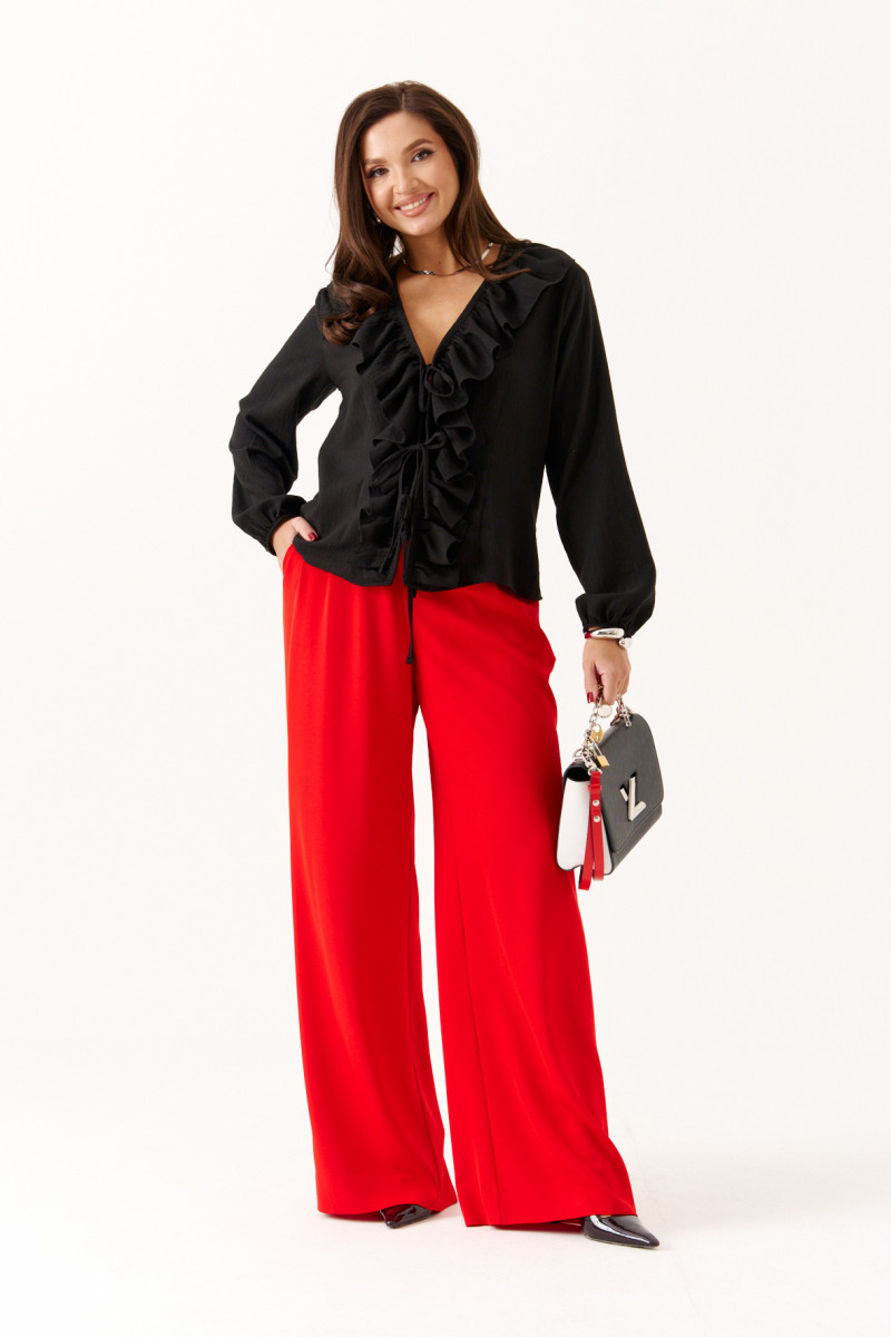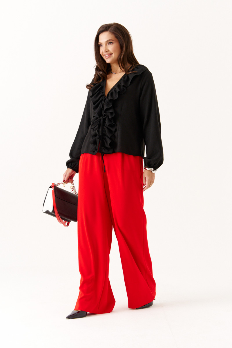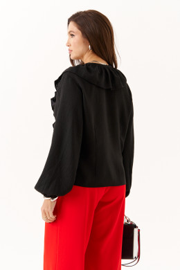 Женская блузка с большим дополнением хлопка прямого силуэта, чёрного цвета Легкая и воздушная блузка, идеально подходящая для повседневной носки. Модель обладает прямым силуэтом и комфортной посадкой. Перед украшен притачной тесьмой, идущей до низа изделия, с декоративными воланами вдоль планки, добавляющими женственности и изящности. Блузка завязывается на три завязки в нижней части. Горловина V-образная, тем самым обеспечивает дополнительный комфорт и элегантность. Длинные втачные рукава с низом, обработанным на резинке со сборкой, придают модели легкий и немного романтичный образ. Это универсальный базовый вариант, прекрасно сочетающийся с разными гардеробными элементами и создающий стильный образ в любой ситуации.