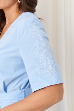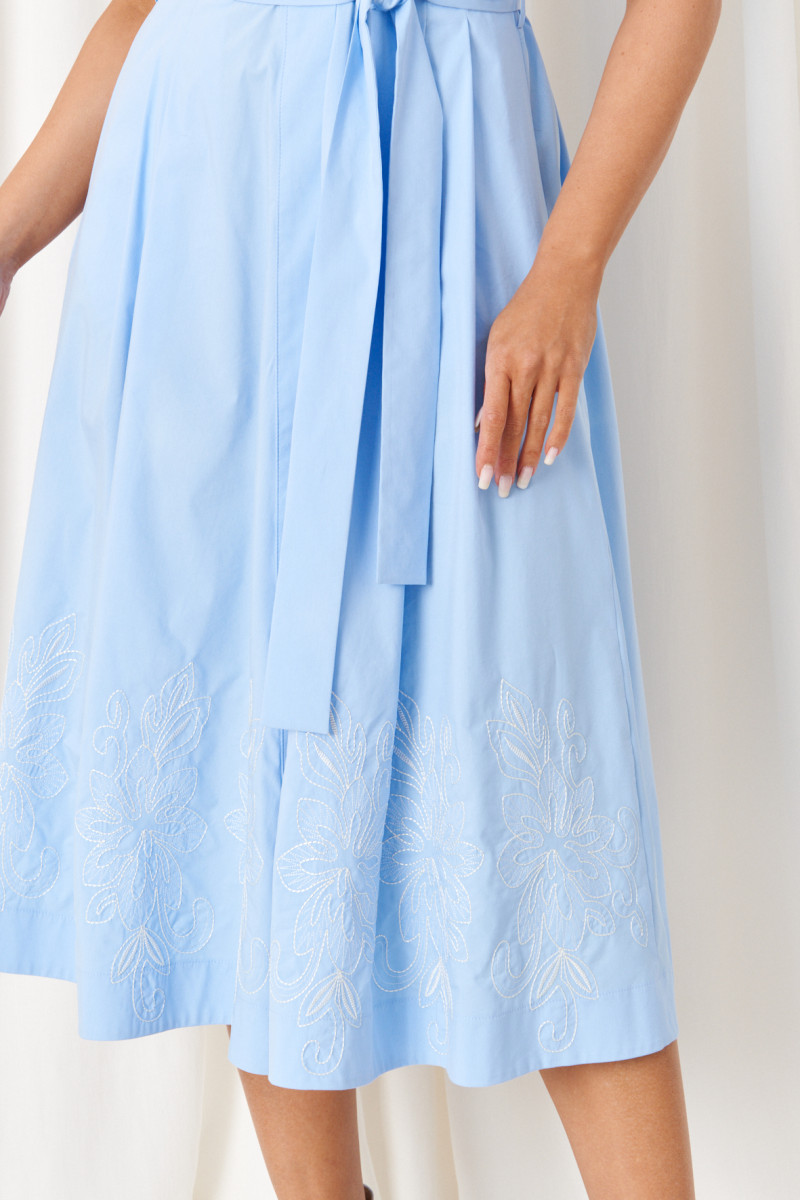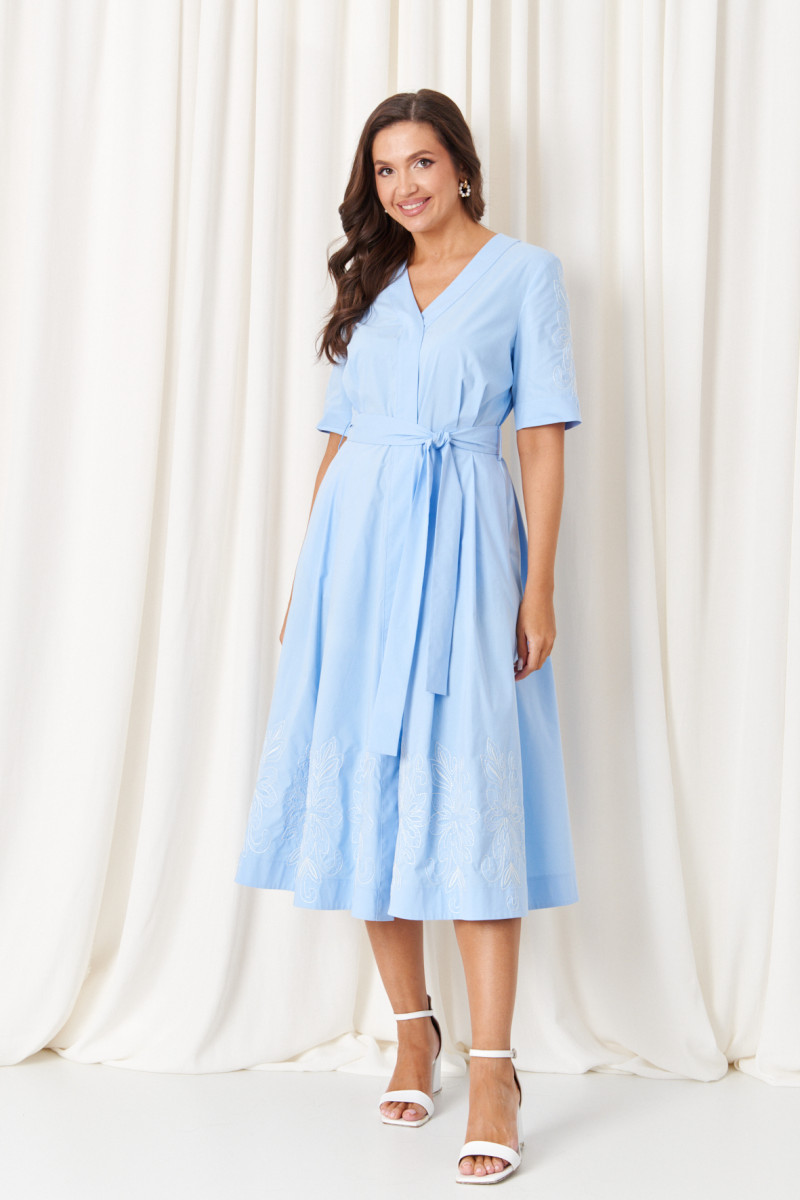 Это женское платье из высококачественной смесовой ткани с богатым содержанием хлопка, создающей приятное ощущение комфорта и легкости. Модель выполнена с отрезным по линии талии силуэтом. Лиф спинки украшен эластичной вставкой на резинке по талии, что обеспечивает идеальную посадку и комфорт при движении. Передняя часть лифа отличается двумя аккуратными защипами, придающими изделию дополнительную выразительность. Нижняя часть платья — юбка, расширенная к низу, — создает мягкую и плавную силуэтную линию, а защипы на передней полотнище добавляют объем и изюминку дизайна. В боковых швах встроены потайные карманы и шлевки по линии талии, что позволяет сочетать функциональность с эстетикой. Горловина оформлена V-образной планкой, придающей модели изящность, а застежка выполнена супатным способом на обметанных петлях и пуговицах, что обеспечивает надежность и удобство при надевании. Рукава втачные длиной до локтя украшены красивой декоративной вышивкой в виде цветов, что создает особую изюминку образа. Общий комплект завершает изысканный голубой оттенок, а длина платья — миди — подходит для разнообразных случаев, создавая элегантный и стильный облик.