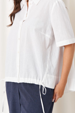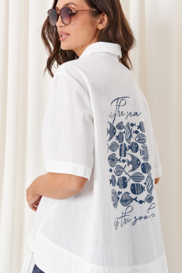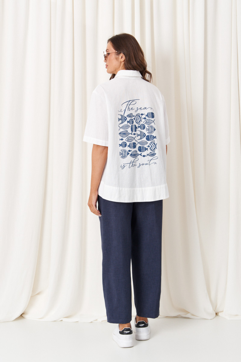 Этот женский костюм из хлопковой ткани включает в себя белую блузку и элегантные синие брюки, для повседневной носки. Блузка выполнена в прямом силуэте, с двумя нагрудными вытачками, которые подчеркивают линию переда. Задняя часть украшена дизайнерской печатью в виде рыбок, добавляющей оригинальности и индивидуальности образу. Боковой шов смещен на перед, что создает интересный визуальный эффект. Воротник у блузки — классический рубашечный, рукава втачные длиной чуть ниже локтя. Застежка центральная бортовая на обметанные петли и пуговицы, а в нижней части переда расположены шнурки, позволяющие регулировать затягивание и создавать разнообразные стильные образы. Синие брюки зауженного к низу кроя отлично сочетаются с белой блузкой. Верхний срез брюк оформлен притачным поясом с вставкой на резинке в боковой части, что обеспечивает комфортную посадку и легкость при носке. Застежка на одну обметанную петлю и пуговицу, а также молнию в среднем шве для удобства и надежности. В задней части брюк расположена кокетка, талиевые вытачки, а также накладные карманы с вытачками, что придает изделию строгость и функциональность. В боковом шве есть карман с подкрайным бочком, обеспечивающий практичность. В нижней части брюки украшены дополнительными вытачками, которые подчеркивают силуэт и обеспечивают идеальную посадку. Этот костюм — отличный выбор для тех, кто ценит комфорт, качество и современный стиль, сочетая простоту и оригинальные дизайнерские решения.