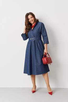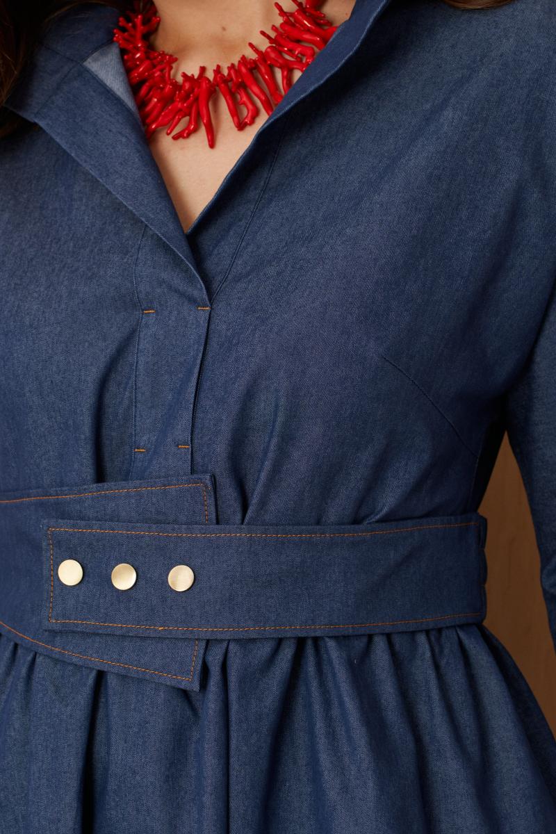 Платье женское из хлопковой ткани для повседневной носки. Платье отрезное по линии талии и имеет небольшую сборку. Перед имеет две нагрудные вытачки, а также дизайнерскую вышивку в виде веточки рябины. В боковых швах располагаются прорезные карманы. Горловина обработана втачной планкой с нахлестом в V-образной горловине, а также воротником-стойкой. Рукава втачные, длиной. ниже локтя. Низ рукава обработан отлетной манжетой. Юбка платья расширенная. Платье укомплектовано поясом из основной ткани изделия. Платье без подкладки. Пояс со вставкой на резинке, застежка на кнопки. Длина изделия миди. Данное платье синего оттенка станет незаменимой вещью в вашем гардеробе, оно отлично будет сидеть и смотреться на любой фигуре.