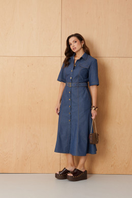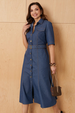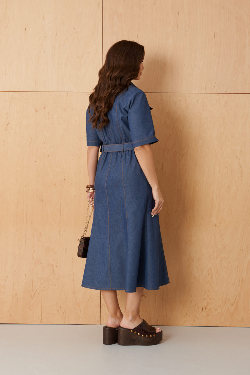 Это женское платье из хлопковой джинсовой ткани, идеально подходящее для повседневной носки. Модель выполнена в длине миди и обладает универсальным синим оттенком. Передняя часть платья отрезная по линии талии, с имитацией пояса, а по спинке есть небольшая сборка в области талии, что обеспечивает комфортную посадку и красивый силуэт. Лиф украшен двумя вертикальными рельефами и двумя декоративными клапанами, а застежка выполнена на обметанные петли и пуговицы, что добавляет нотки классики и практичности.