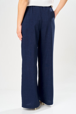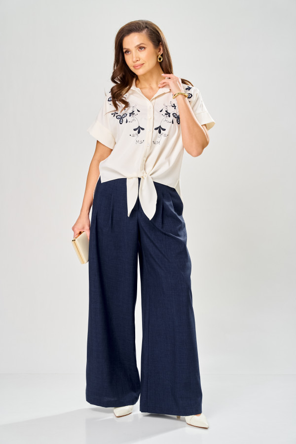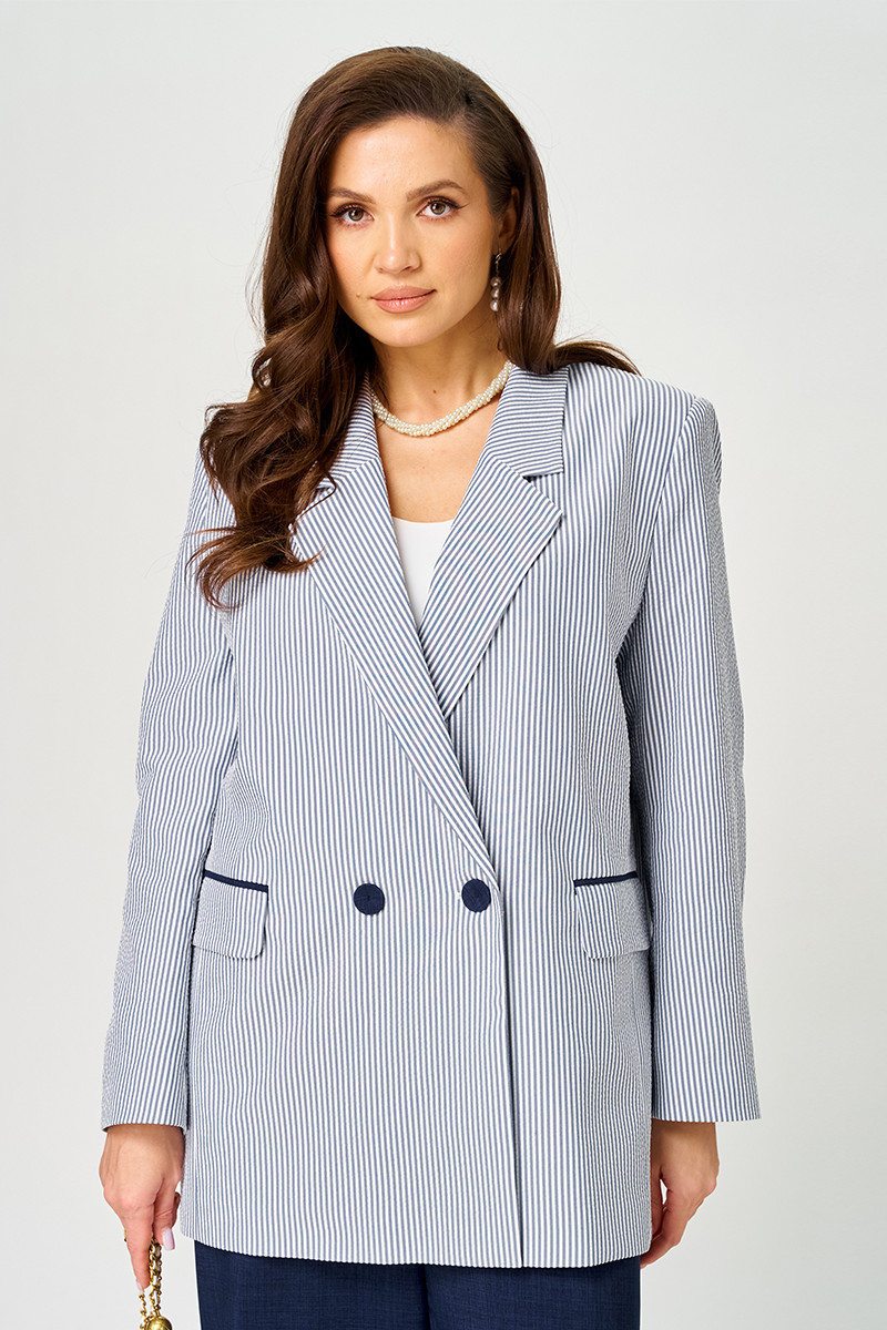 Этот женский костюм выполнен из смесовой ткани с добавлением хлопка, что обеспечивает комфорт и долговечность. Он включает в себя жакет и брюки, гармонично сочетающиеся по стилю и цвету. Жакет полуприлегающего силуэта в бело-синем оттенке с полосатым узором. Застежка в жакете двубортная на обметанные петли и обтяжные пуговицы, которые создают аккуратный и завершенный вид. На переде расположены два прорезных кармана в рамку с двумя обтачками и клапаном, и вставками из синей ткани, добавляющими интересный акцент. Спинка жакета украшена двумя средним швом. Жакет имеет бочок. Воротник выполнен в пиджачном стиле, что делает модель более строгой и классической. Рукава втачные длинные что придает образу деловой нотки и комфорт при носке. Жакет на хлопковой подкладке. Брюки прямые из смесовой ткани с добавлением льна. Верхний срез брюк обработан притачным поясом с вставкой на резинке в боковой и задней части, обеспечивая хорошую посадку и комфорт. В боковом шве имеются карманы с подкройным бочком. Это стильный и элегантный костюм бело-синего оттенка, идеально подходящий для деловых встреч и повседневных мероприятий, сочетающий в себе классические линии и современный дизайн.