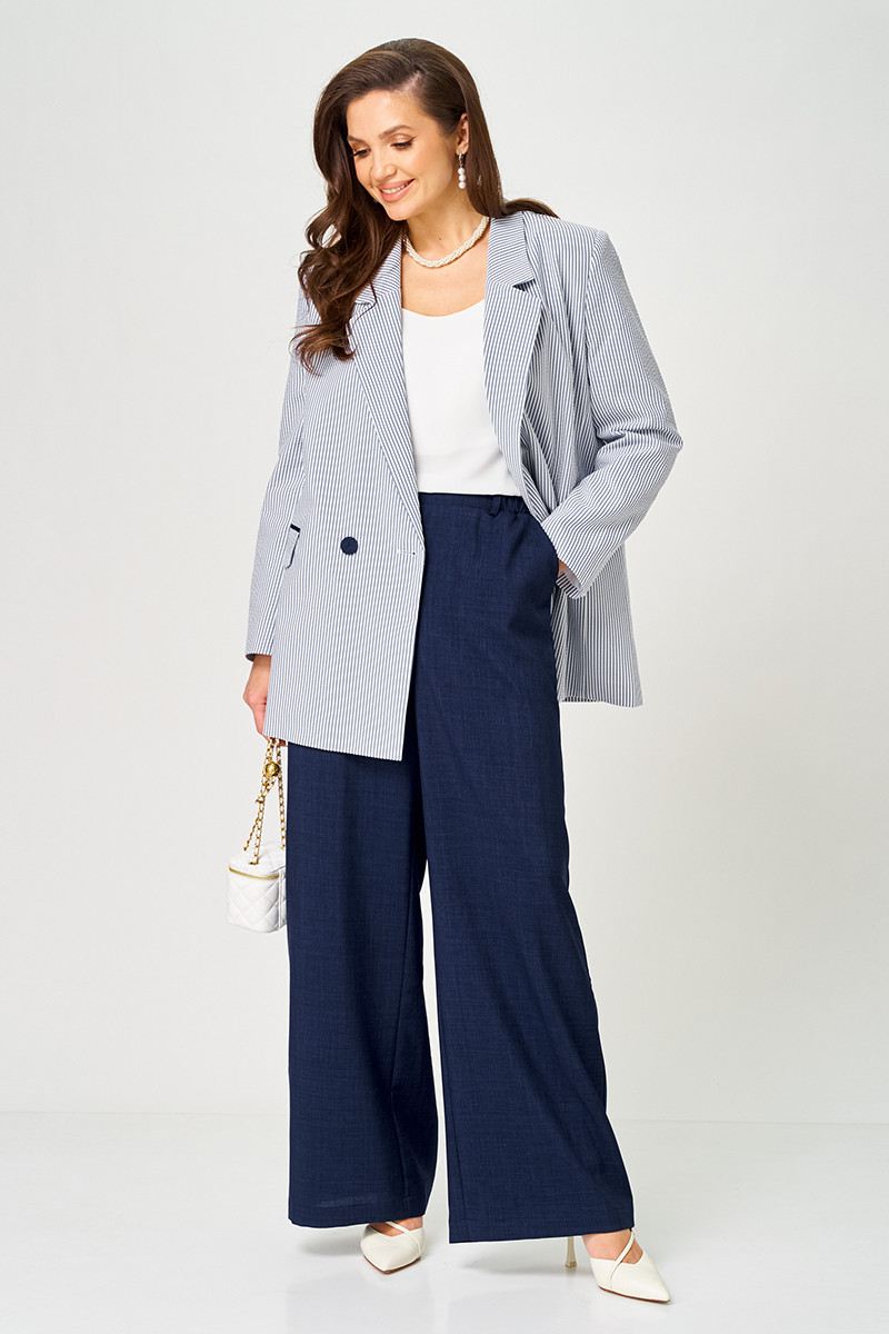 Элегантный женский жакет выполнен из прочной и комфортной смесовой ткани с добавлением хлопка, что обеспечивает долгий срок службы и приятные ощущение при носке. Жакет бело-синего оттенка с классическим полосатым узором, придающим образу свежести. Застежка двубортная с аккуратными обметанными петлями и обтяжными пуговицами. Передняя часть украшена двумя прорезными карманами, оформленными в рамку с двумя обтачками и клапанам, что добавляет изделию функциональности и интересный визуальный акцент. Вставки из синей ткани в обтачках создают яркий акцент, оживляя дизайн. Спинка жакета со средним швом, что подчеркивает его структуру. В модели предусмотрен бочок. Воротник выполнен в пиджачном стиле, что делает модель более строгой и элегантной, идеально подходящей для деловых и повседневных образов. Длинные втачные рукава придают образу деловой нотки и позволяют чувствовать себя комфортно в течение всего дня. Жакет изготовлен на хлопковой подкладке, что обеспечивает приятное ощущение на теле и добавляет изделию прочности.