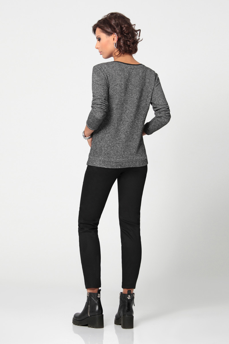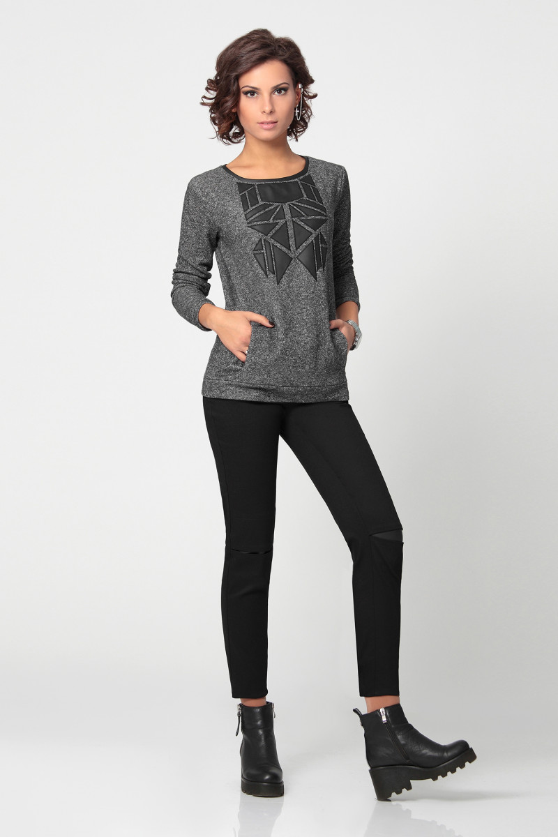 Джемпер из меланжевого трикотажа. Прямого силуэта, в спортивном стиле. Спереди потайной карман "кенгуру". Также спереди декор в виде кожаной аппликации с вышивкой. Рукав длинный, с манжетой. По низу джемпера широкий пояс. Джемпер идеально подойдет молодым активным девушкам, предпочитающим спортивный стиль в одежде. Этот стильный, удобный, теплый джемпер станет отличным дополнение к вашему гардеробу.