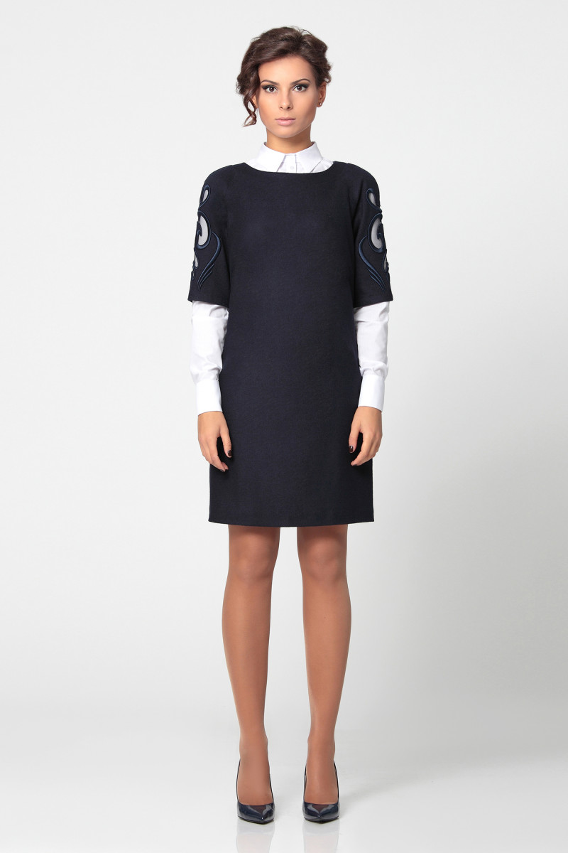 Платье из шерстяной ткани. Прямого, слегка расширенного силуэта. Современный лаконичный крой, простые линии придадут образу строгости. Элемент дерзости в изделие вносит объемная со вставками из сетки вышивка на рукавах. Дополнительным бонусом является то, что это платье очень теплое и согреет даже в самый сильный холод. Изделие на трикотажной подкладке. Платье прекрасно сочетается как с белыми блузками, так и с яркими джемперами.
