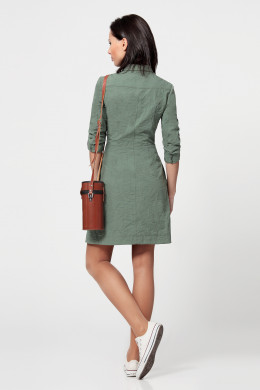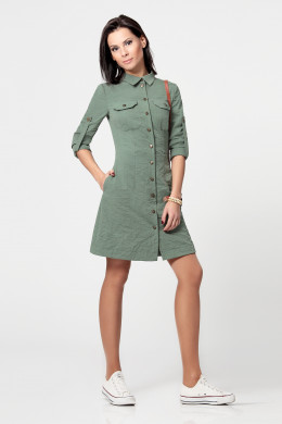 Платье-рубашка. Из плотной хлопковой ткани. В стиле милитари. С отложным воротником на отрезной стойке. С длинным рукавом с манжетой. Рукав можно подворачивать и фиксировать патой. Спереди застежка на джинсовые пуговицы. На груди накладные карманы. Платье отрезное по талии, юбка слегка разведена. Платье прекрасно подчеркнет тонкую талию, а расклешенная юбка вносит нотку романтичности.