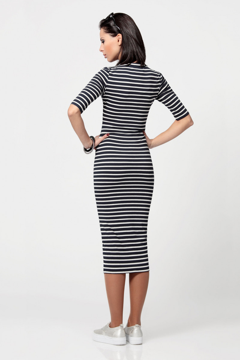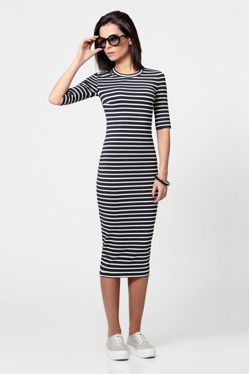 Платье. Из трикотажа синего цвета в бежевую полоску (с люрексом). Длинна миди. Лаконичное, без лишних деталей. С овальным вырезом горловины. С коротким рукавом. Платье облегает фигуру, подчеркивая все изгибы. Визуально платье вытягивает силуэт.