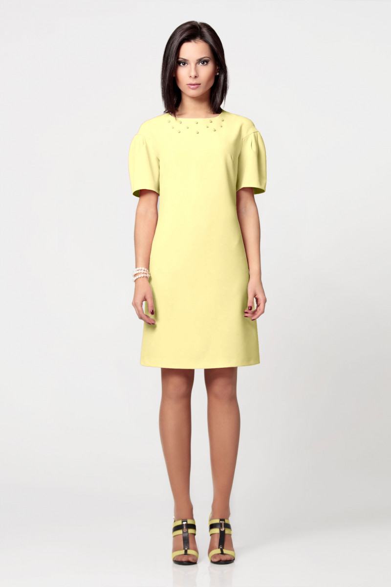 Молодежное стильное платье. Отличный вариант для торжественных мероприятий и вечеринок, свободный крой скрывает недостатки, создает образ женственности и романтики. Платье полуприлегающего силуэта, расклешенное к низу. Горловина округлая, украшена декоративными бусинами, плечо занижено, рукавчик до локтя со складками от плеча. Спинка с разрезом и функциональной молнией.