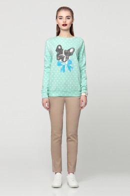 Свитшот из плотного хлопкового трикотажа. С овальным вырезом горловины, горловина обработана планкой. По спинке вырез "капелька". По низу изделие на широком поясе. Рукав длинный, с манжетой. Спереди нанесен принт.