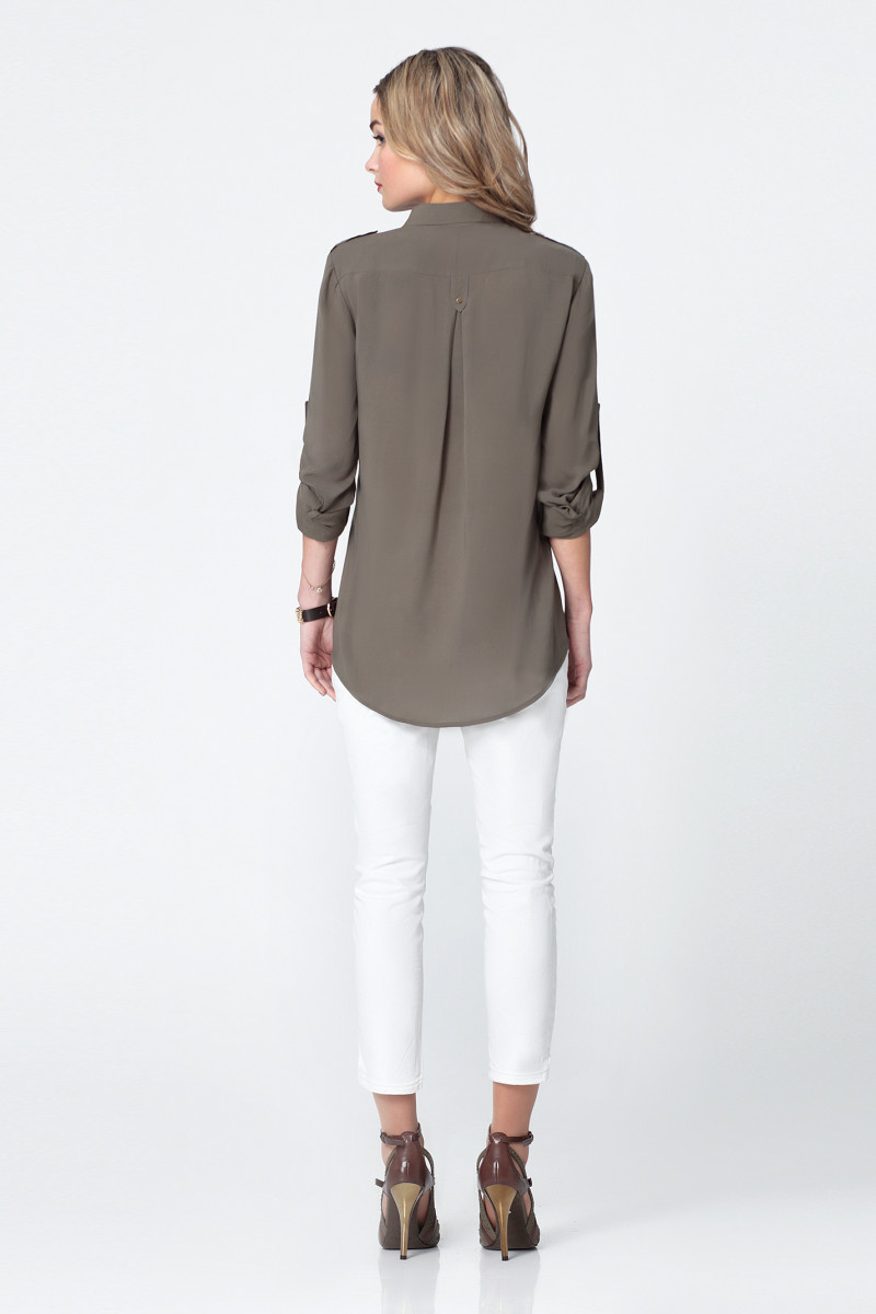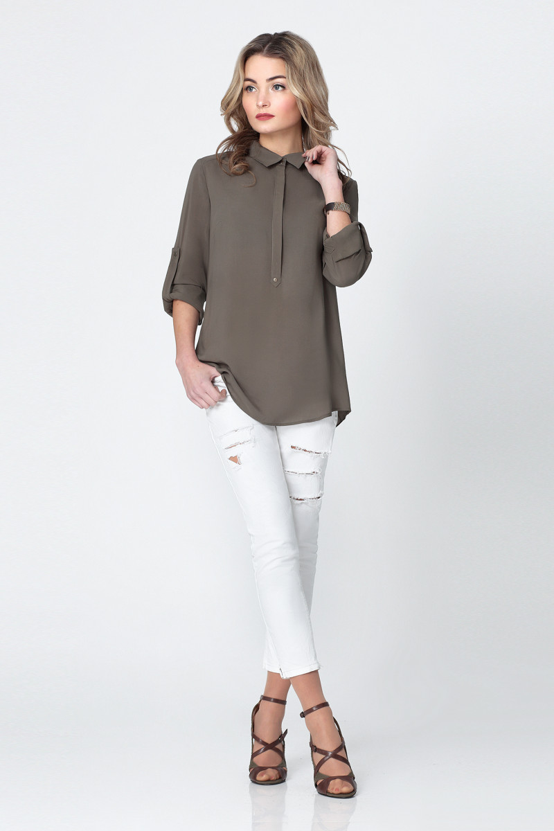 Блузка из вискозной ткани. Прямая, слегка расширенного силуэта. С воротником на отрезной стойке. По переду с потайной застежкой до линии талии. С длинным рукавом с манжетой. Манжета фиксируется патой. По спинке из-под кокетки выходит складка.