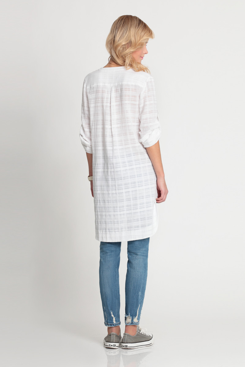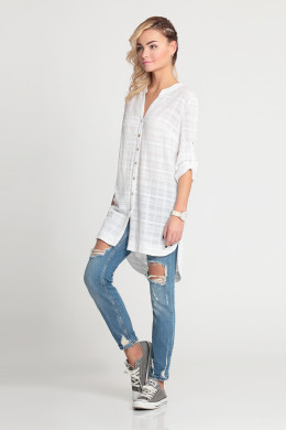 Удлиненная блузка из тонкой хлопковой ткани. Прямого, свободного кроя. С застежкой по планке на пуговицы. С воротником-стойкой. Рукав длинный, с манжетой, с патой с застежкой на пуговицу. Спинка длиннее переда. По бокам снизу концы закругленные.