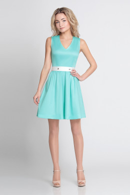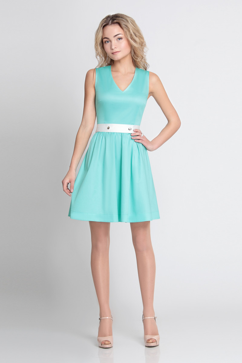 Платье из хлопковой ткани с легким блеском. С глубоким V-образным вырезом горловины. Без рукава. Лиф прилегающий. Отрезное по линии талии. Юбка с легкой сборкой. Платье дополняется съемным поясом из ткани контрастного цвета, с застежкой на две кнопки.