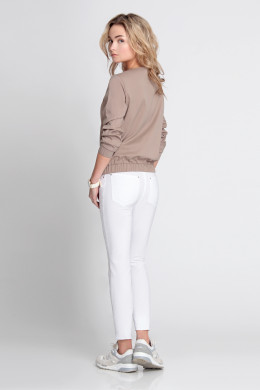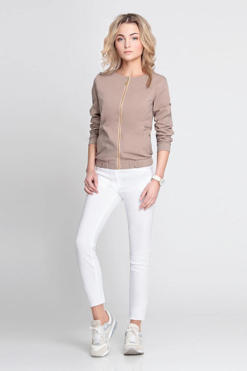 Бомбер, из хлопковой ткани со стрейчем. С овальным вырезом горловины. С длинным рукавом с манжетой на резинке. Бомбер на поясе с резинкой. По переду застежка на металлическую молнию. Два функциональных кармана, вход оформлен листочкой.