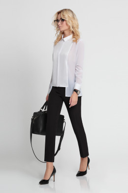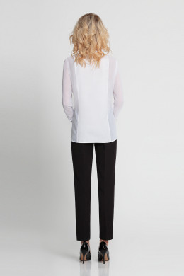Блузка. С отложным воротником на отрезной стойке. С длинным рукавом с манжетой. С потайной застежкой по переду. С перепадом длинны, центральная часть переда немного короче. Центральная часть переда, спинки, воротник и манжеты выполнены из хлопковой ткани, рукава и бочки - из шифона.