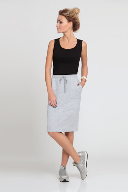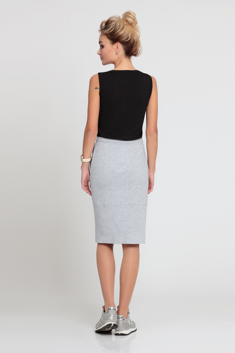 Юбка из трикотажа. Прямого силуэта, с подрезами. На широком поясе с резинкой, с кулисой. По переду накладные карманы.