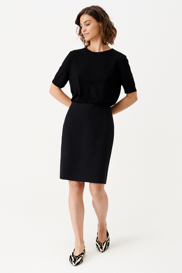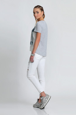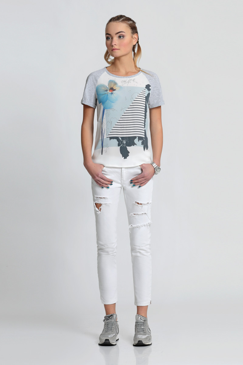 Джемпер из хлопкового трикотажа. Прямого, слегка расширенного силуэта. С коротким рукавом реглан. Перед из шифона. С модным прринтом в морском стиле. Отличный вариант для летних ежедневных образов.
