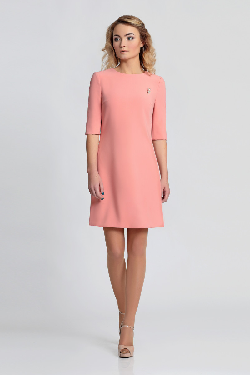 Платье. Нарядное, прямого силуэта. С овальным вырезом горловины. Скоротким рукавом. На спинке по горловине вырез "слезка", с застежкой на три пуговицы. По спинке две складки. Спереди брошь.
