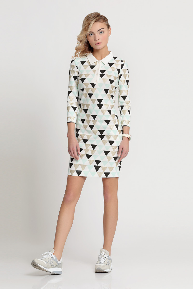 Платье из хлопкового принтованного трикотажа. В спортивном стиле, полуприлегающего силуэта. С воротником и планкой спереди из однотонной ткани. Рукав 3/ 4.