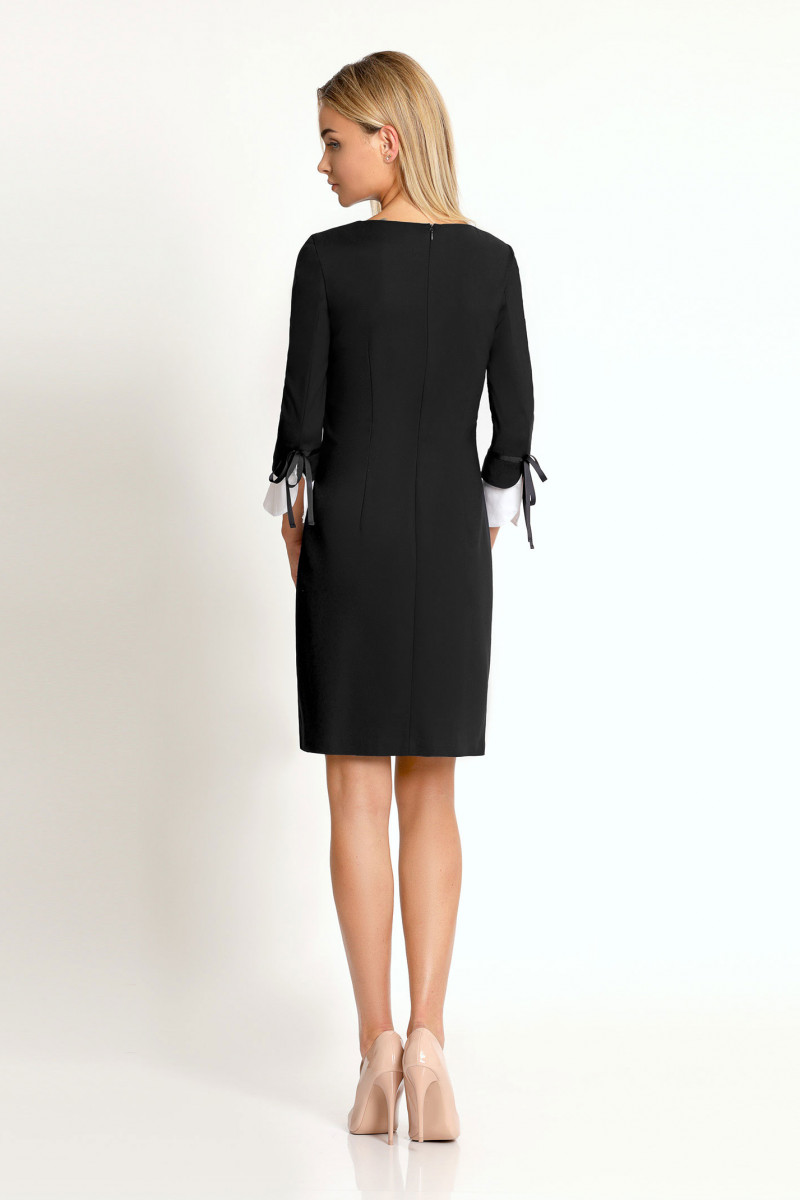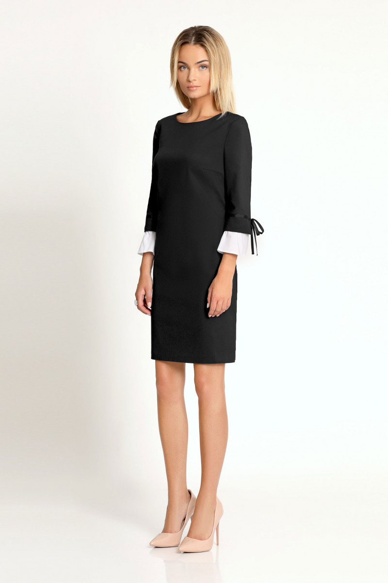 Платье из плотной хлопковой ткани с эластаном. Платье полуприлегающего силуэта. С овальным вырезом горловины. Рукав 3/ 4 со съемной манжетой из тонкой хлопковой ткани контрастного цвета. По рукаву настрочена декоративная лента переходящая в завязки. Застежка на потайную молнию в среднем шве спинки.