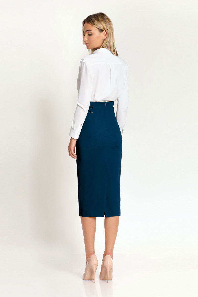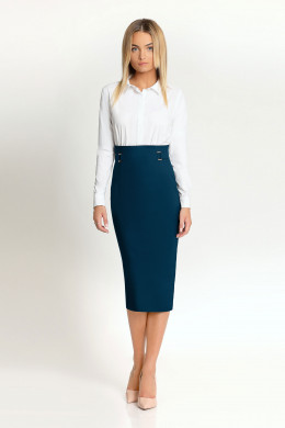 Юбка-карандаш из плотной хлопковой ткани с эластаном. Талия немного завышена. По бокам декоративный пояс с рамками по переднему и заднему полотнищам. Застежка на потайную молнию в среднем шве спинки.